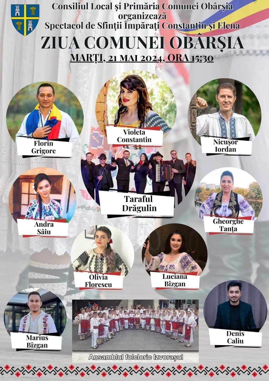 Dacă de Florii a fost spectacol folcloric în satul Câmpu Părului din comuna Obârșia, pe 21 mai 2024, de Sfinții Împărați Constantin și Elena, este din nou prilej de sărbătoare pentru cetățenii localității din sudul județului. De data aceasta este Ziua Comunei, iar Primăria și Consiliul Local au pregătit din nou un regal folcloric pentru localnici, și nu doar pentru ei. Iar cap de afiș ai concertului extraordinar sunt de data aceasta Violeta Constantin, Taraful Drăgulin, Nicușor Iordan, dar și Florin Grigore, originar din comuna Obârșia.