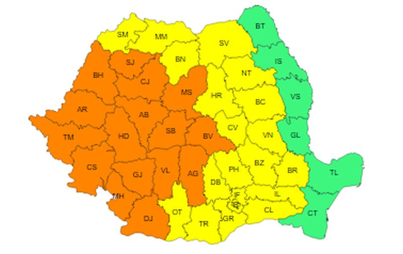 „În Banat, Crișana, cea mai mare parte a Transilvaniei și a Olteniei și în nord-vestul Munteniei vor fi intensificări ale vântului (rafale în general de 60…80 km/h), vijelii, grindină de medii și posibil mari dimensiuni, averse torențiale și frecvente descărcări electrice. În intervale scurte de timp (1-3 ore) sau prin acumulare cantitățile de apă vor fi de 30…40 l/mp și izolat de peste 50…60 l/mp”, au precizat reprezentanții ANM.
