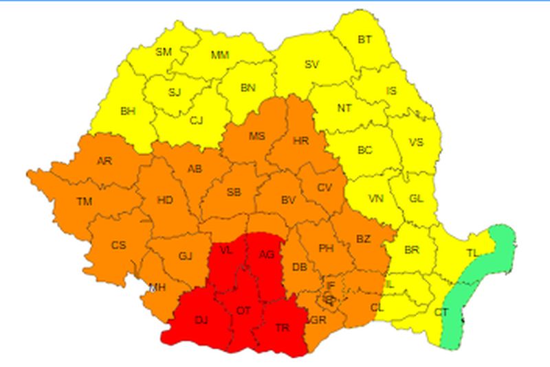 Sâmbătă este Cod roșu de val de căldură persistent și intens, caniculă, disconfort termic deosebit de accentuat în județele Dolj, Olt, Teleorman și sudul județelor Vâlcea și Argeș.