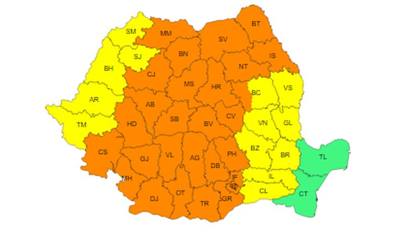 „În Oltenia, cea mai mare parte a Transilvaniei și Munteniei, jumătatea de nord a Moldovei și local în Banat și în Maramureș, vor fi perioade cu averse torențiale, intensificări de scurtă durată ale vântului și vijelii, cu viteze la rafală în general de 70…90 km/h, descărcări electrice și grindină. În intervale scurte de timp (1…3 ore) sau prin acumulare cantitățile de apă vor fi de 25…40 l/mp și pe arii restrânse de peste 50…70 l/mp”, au transmis meteorologii.
