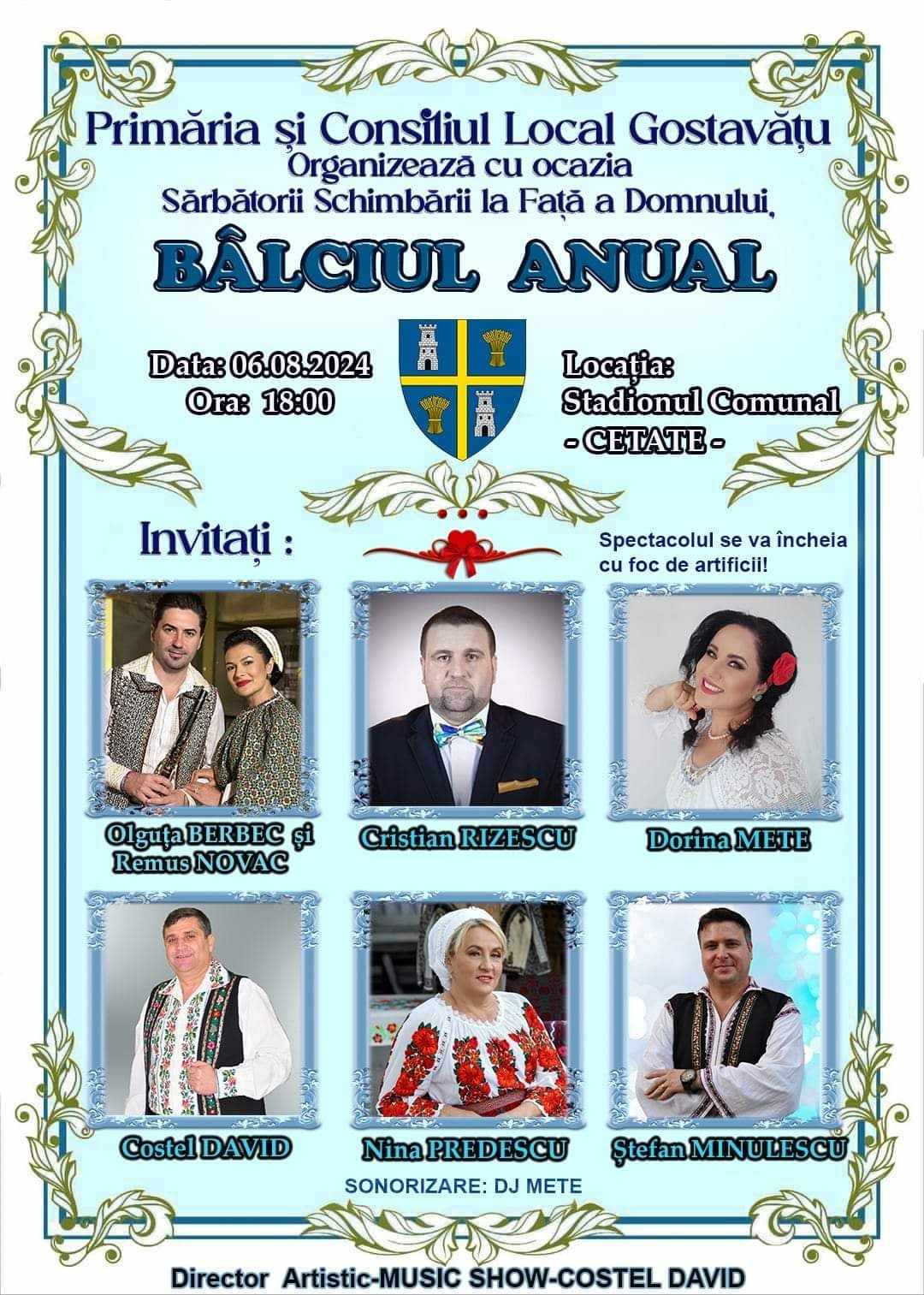 La Gostavățu, în data de 6 august, de sărbătoarea Schimbarea la față a Domnului, pe Stadionul comunal „Cetate” se va desfășura, începând cu ora 18:00, Bâlciul anual. Primăria și Consiliul Local aduc în fața publicului un eveniment marca directorului artistic „MUsic Show – Costel David”, sonorizarea fiind asigurată de DJ Mete. Invitați speciali cu concerte folclorice de mare clasă vor fi Olguța Berbec și Remus Novac (FOTO principală), Cristian Rizescu, Dorina Mete, Costel David, Nina Predescu și Ștefan Minulescu.