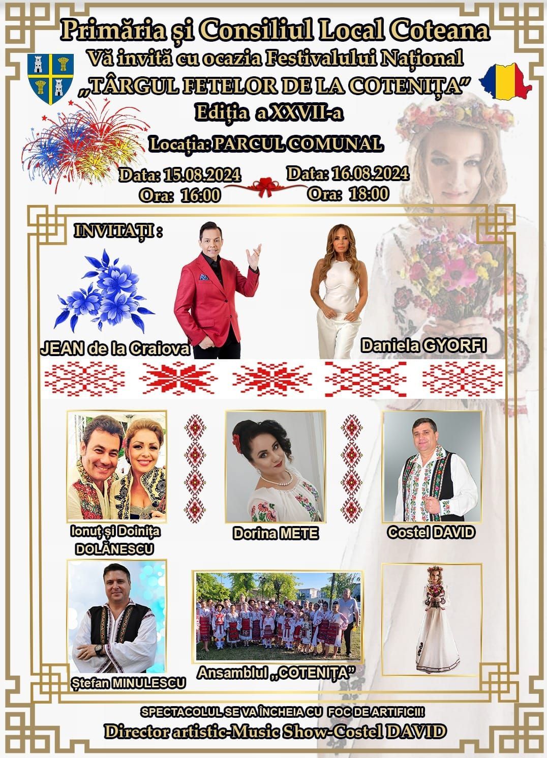 15 și 16 august sunt zilele în care Parcul Comunal din Coteana găzduiește a 27-a ediția a Festivalului Național „Târgul fetelor de la Cotenița”, organizat de Primăria și Consiliul Local. Dacă de Sfânta Maria spectacolul începe la ora 16:00, ziua următoare acesta va debuta la ora 18:00. Invitații speciali de la această manifestare sunt Jean de la Craiova, Ionuț și Doinița Dolănescu, Daniela Gyorfi, Costel David, Dorina Mete, Ștefan Minulescu și Ansamblul „Cotenița” al localității, director artistic fiind Music Show – Costel David.