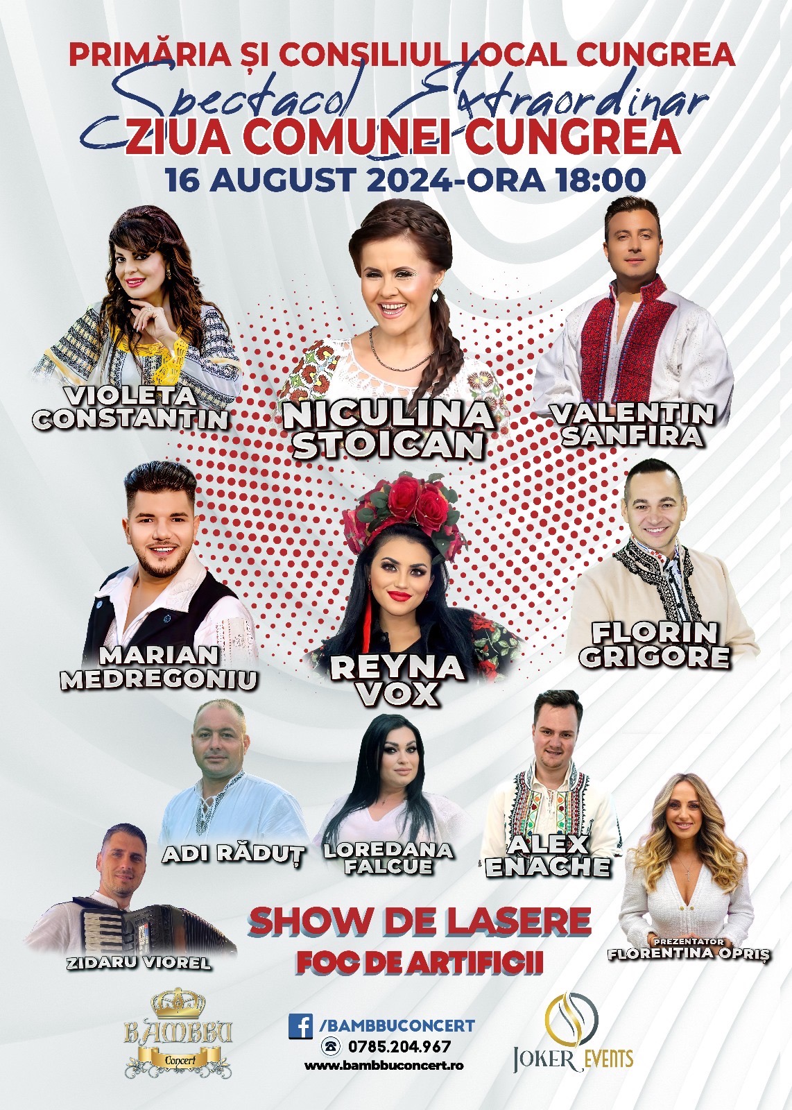 „Dragi cungreni! A venit vremea ca fiicele și fiii comunei noastre să poată fi din nou împreună la tradiționala noastră sărbătoare anuală. Vă așteptăm așadar, vineri, 16 august 2024, ora 18:00, la Ziua comunei Cungrea! Ne vor încânta auzul soliști de marcă. De asemenea, pentru cei mici avem pregătite tobogane și alte surprize. Distracția este garantată!