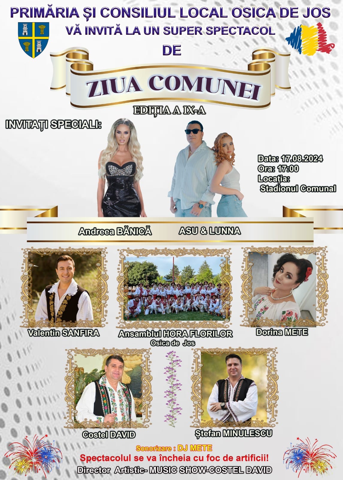 Primăria și Consiliul Local Osica de Jos, în frunte cu edilul Marian Pistol, vor organiza sâmbătă, 17 august, ediția cu numărul 9 a Zilei Comunei, iar într-un super spectacol ce începe la ora 17:00 vor susține recitaluri muzicale Andreea Bănică, ASU și Lunna, Valentin Sanfira, Dorina Mete, Costel David, Ștefan Minulescu și Ansamblul folcloric „Hora Florilor” al localității. Dacă DJ Mete se va ocupa de sonorizare, director artistic este Music Show – Costel David.