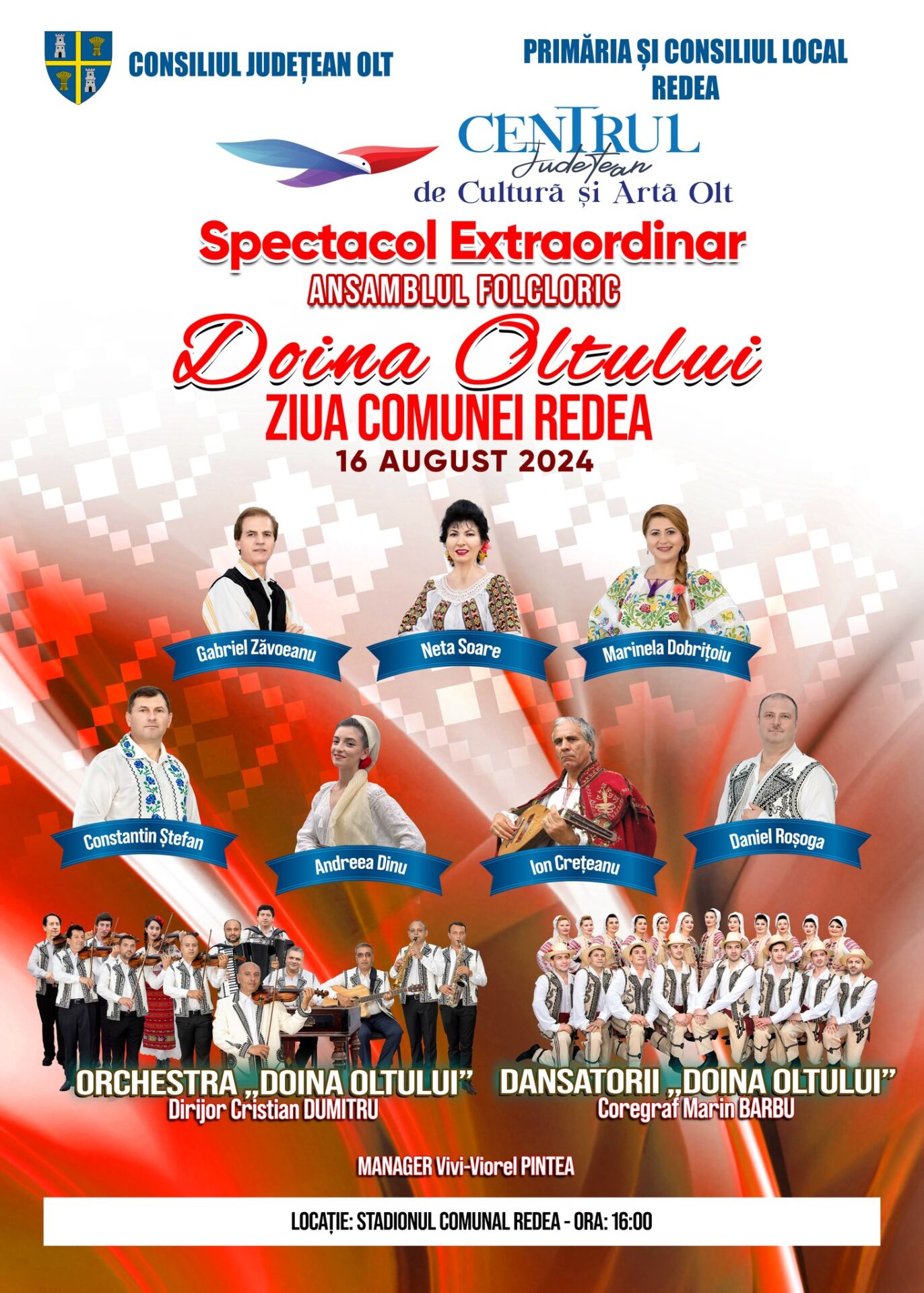 Pentru publicul din Redea, dar și pentru cetățeni din comunele învecinate care vor să participe la această sărbătoare, vor fi în recital artiștii Neta Soare, Gabriel Zăvoeanu, Marinela Dobrițoiu, Constantin Ștefan, Andreea Dinu, Ion Crețeanu și Daniel Roșoga, acompaniamentul muzical fiind asigurat de orchestra „Doina Oltului”, condusă de dirijorul Cristian Dumitru. Bineînțeles că din spectacolul extraordinar organizat de Primăria și Consiliul Local nu vor lipsi nici momentele coregrafice din mai multe colțuri ale țării prezentate de dansatorii „Doina Oltului, al căror coregraf este Florentina Anghel.