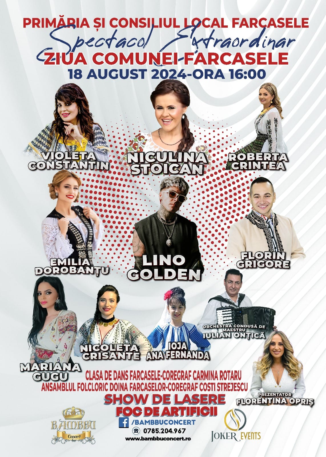 Iar Primăria și Consiliul Local Fărcașele va începe cheful la ora 16:00. Nu doar Niculina Stoican, Roberta Crintea, Emilia Dorobanțu și Lino Golden vor urca pe scenă pentru a susține recitaluri, ci și alți invitați speciali, aceștia fiind Violeta Constantin, Florin Grigore, Mariana Gugu, Nicoleta Crisante, Ana Fernanda Ioja, orchestra condusă de maestrul Iulian Onțică, clasa de dans Fărceșele – coregraf Carmina Rotaru și Ansamblul folcloric „Doina Fărcașelor” – coregraf Constantin Strejescu, prezentator fiind Florentina Opriș.