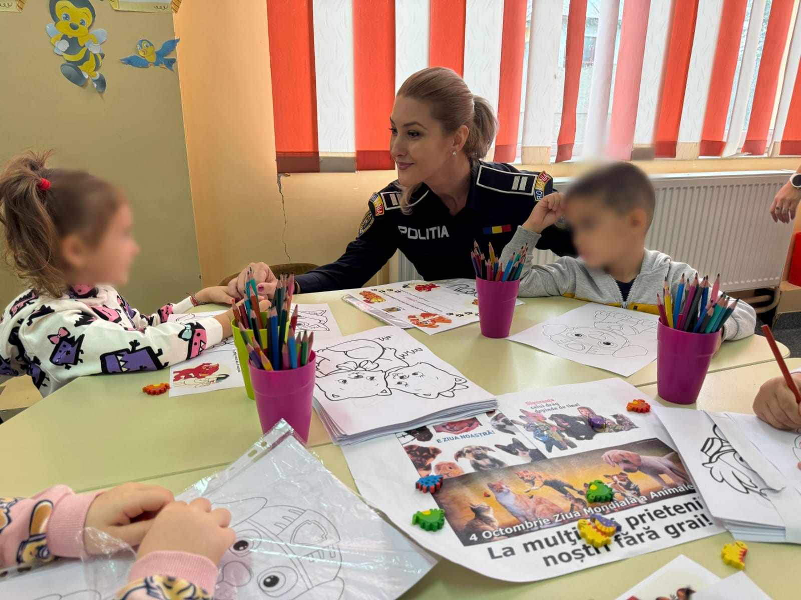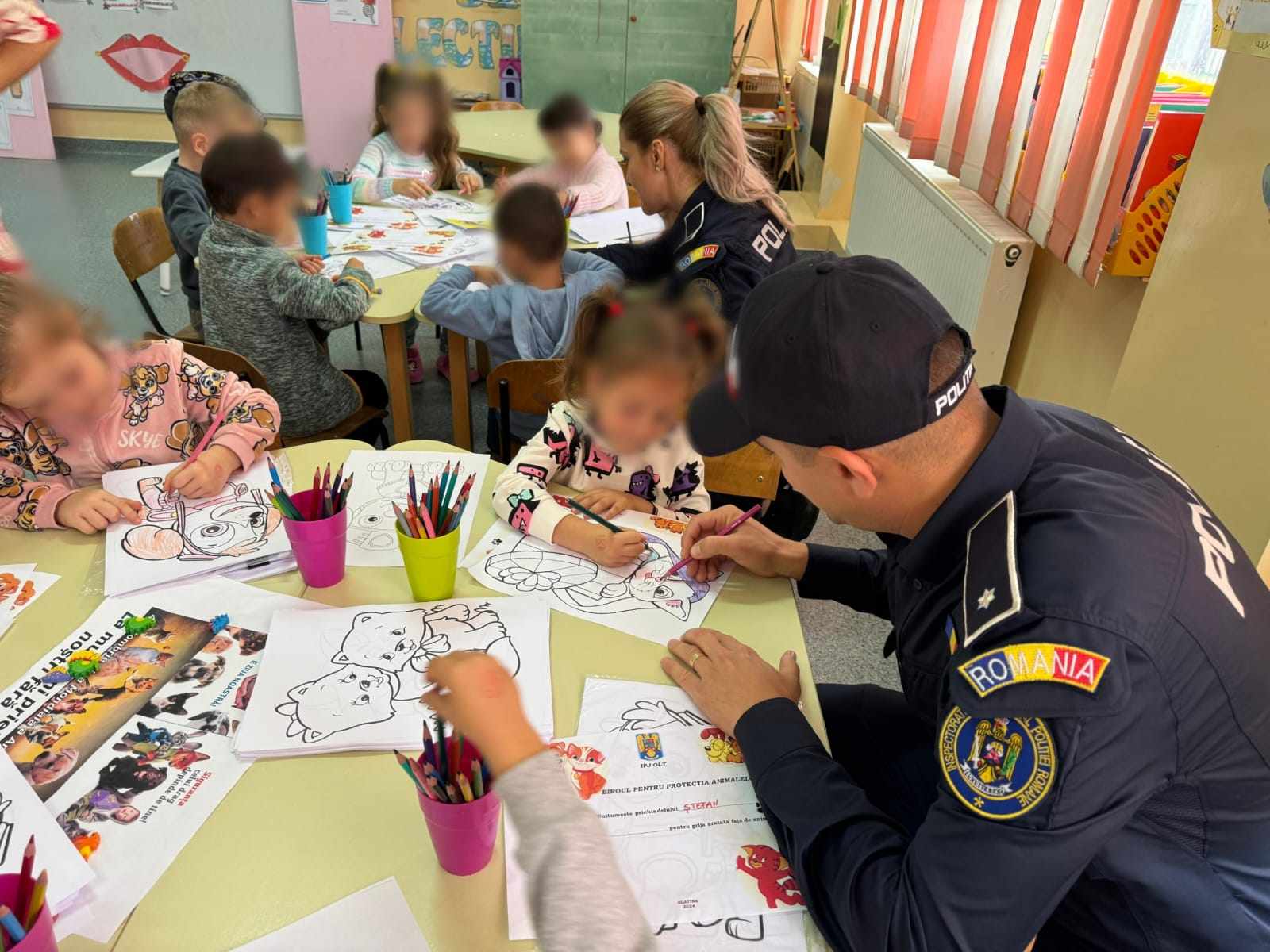 Polițiștii din cadrul Biroului pentru Protecția Animalelor au vizitat vineri, 4 octombrie, o grădiniță din comuna Curtișoara, unde au organizat o serie de activități educative și recreative menite să-i învețe pe cei mici importanța grijii față de animale, în contextul marcării Zilei Mondiale a Animalelor. Pe parcursul vizitei, oamenii legii au distribuit copiilor afișe cu animale de colorat, încurajându-i să-și exprime creativitatea și să își imagineze animalele într-o lume prietenoasă și plină de culori.