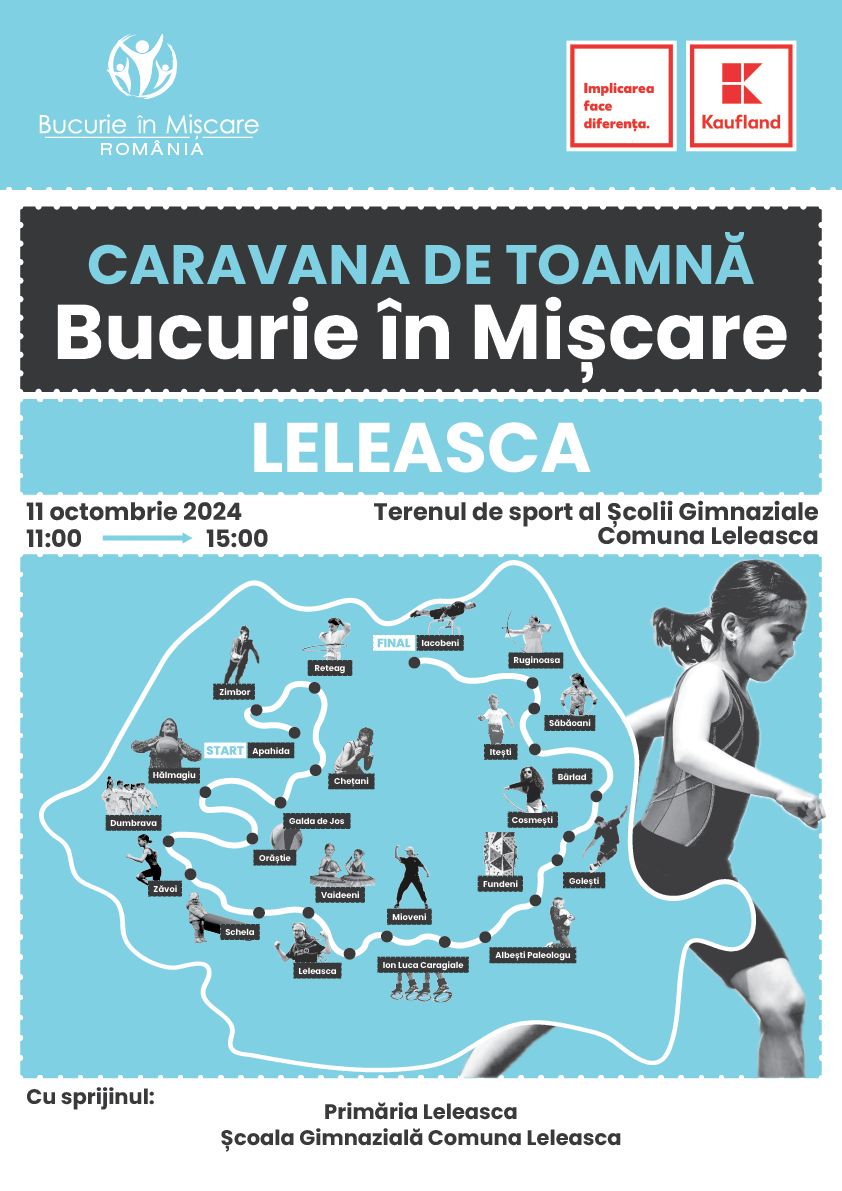 Programul „Bucurie în mișcare”, cel mai amplu program de promovare a sportului de masă din România ajunge anul acesta, în cadrul caravanei de toamnă ce se desfășoară în perioada 30 septembrie – 23 octombrie în 23 de sate și comune, din tot atâtea județe ale țării. Iar în data de 11 octombrie 2024, caravana se va opri și în comuna Leleasca, situată în nordul județului Olt, cei mici și cei mari deopotrivă fiind așteptați la mișcare între orele 11:00 – 15:00 pe terenul de sport al Școlii Gimnaziale Leleasca.