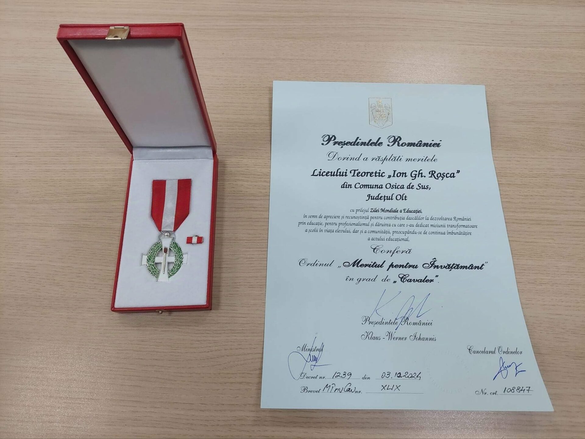 „Ieri (marți, 8 octombrie 2024 n.r.), în cadrul ceremoniei organizate cu prilejul Zilei Mondiale a Educației, la Palatul Cotroceni, Președintele României E.S. Domnul Klaus Iohannis a acordat Liceului Teoretic ‘Ion Gh. Roșca’ Osica de Sus Ordinul ‘Meritul pentru Învățământ în grad de Cavaler’. Mulțumim dascălilor, elevilor, părinților și partenerilor noștri!’, este mesajul transmis la scurt timp de conducerea liceului oltean.