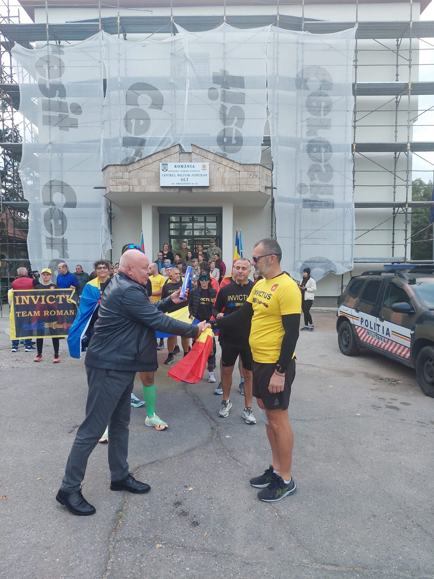 La momentul de predare-primire al „Ștafetei Veteranilor Invictus” a fost prezent prefectul Ștefan Nicolae, reprezentantul Guvernului în teritoriu, precum și mai mulți angajați ai CMJ Olt. Iar pentru ca evenimentul să aibă loc fără incidente, echipaje ale Poliției Locale Slatina au însoțit alergătorii până la ieșirea din municipiu pe Podul Olt, spre Caracal.