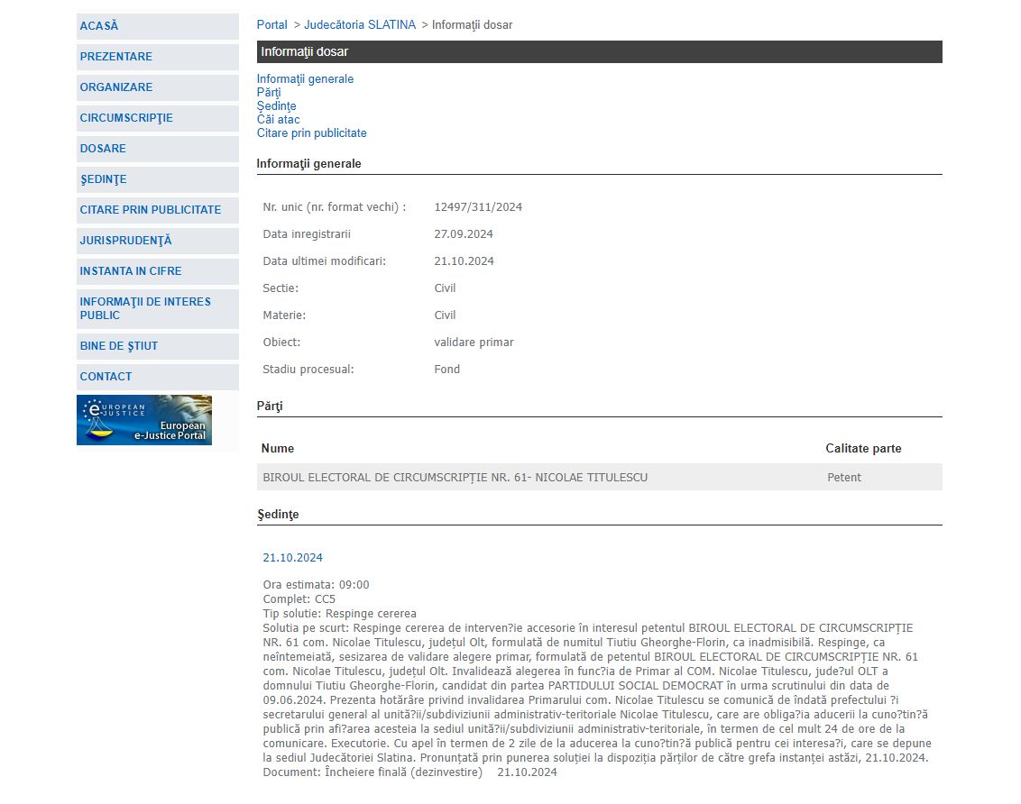 „Respinge cererea de intervenție accesorie în interesul petentul Biroul Electoral de Circumscripție Nr. 61 comuna Nicolae Titulescu, judeţul Olt, formulată de numitul Tiutiu Gheorghe-Florin, ca inadmisibilă. Respinge, ca neîntemeiată, sesizarea de validare alegere primar, formulată de petentul Biroul Electoral de Circumscripție Nr. 61 comuna Nicolae Titulescu, judeţul Olt. Invalidează alegerea în funcția de primar al comunei Nicolae Titulescu, județul Olt, a domnului Tiutiu Gheorghe Florin, candidat din partea Partidului Social Democrat în urma scrutinului din data de 9 iunie 2024. Prezenta hotărâre privind invalidarea primarului comunei Nicolae Titulescu se comunică de îndată prefectului și secretarului general al unității/subdiviziunii administrativ-teritoriale Nicolae Titulescu, care are obligația aducerii la cunoștință publică prin afișarea acesteia la sediul unității/subdiviziunii administrativ-teritoriale, în termen de cel mult 24 de ore de la comunicare. Executorie. Cu apel în termen de 2 zile de la aducerea la cunoștință publică pentru cei interesați, care se depune la sediul Judecătoriei Slatina. Pronunţată prin punerea soluţiei la dispoziţia părţilor de către grefa instanţei astăzi (luni n.r.), 21 octombrie 2024”, este soluția pe scurt dată de instanță în dosarul 12497/311/2024, judecat de magistrații Secției Civile.