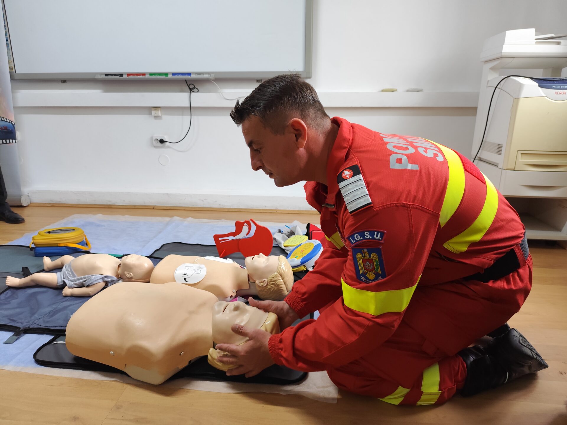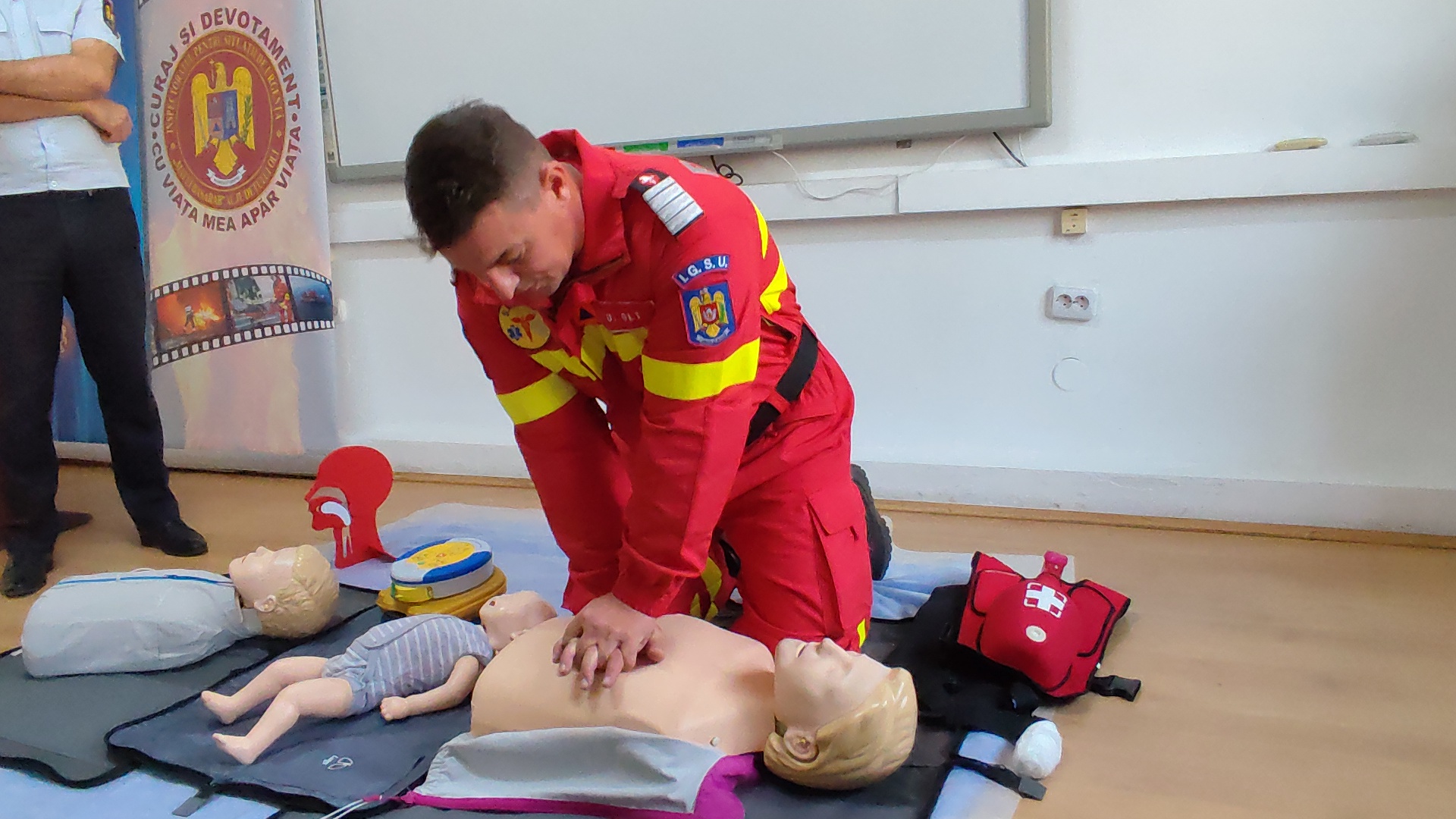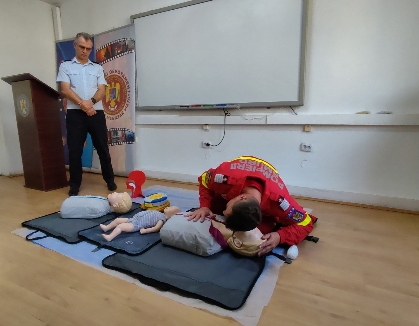 Iar la finalul prezentării acestor date, Cătălin Stănciuleasa, paramedic SMURD Olt, a relatat în câteva cuvinte ce manevre se aplică în cazul unui pacient aflat în stop cardio-respirator, dar și modul în care se folosește defibrilatorului semiautomat. Concret, asistentul medical principal a prezentat manevrele de resuscitare cardio-pulmonare care se fac la un pacient adult, copil, sugar sau nou-născut. În câteva cuvinte, pompierul a spus că la un adult ce are nevoie de astfel de manevre se fac 30 de compresii toracale externe cu două ventilații, la un copil 15 compresii cu două ventilații, dar înainte se fac și cinci ventilații salvatoare, la un sugar sunt făcute 15 ventilații toracale externe cu două ventilații, iar la un nou născut se fac doar trei compresii cu o ventilație. Însă, la ultimele două categorii de pacienți, mai sunt facute și cele cinci ventilații salvatoare, dar și pufuri gură – gură – nas.