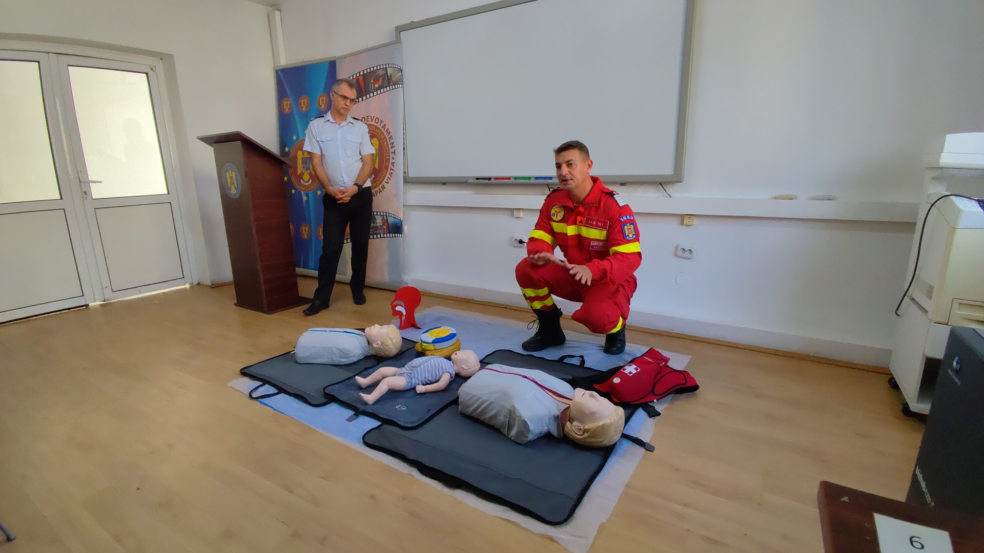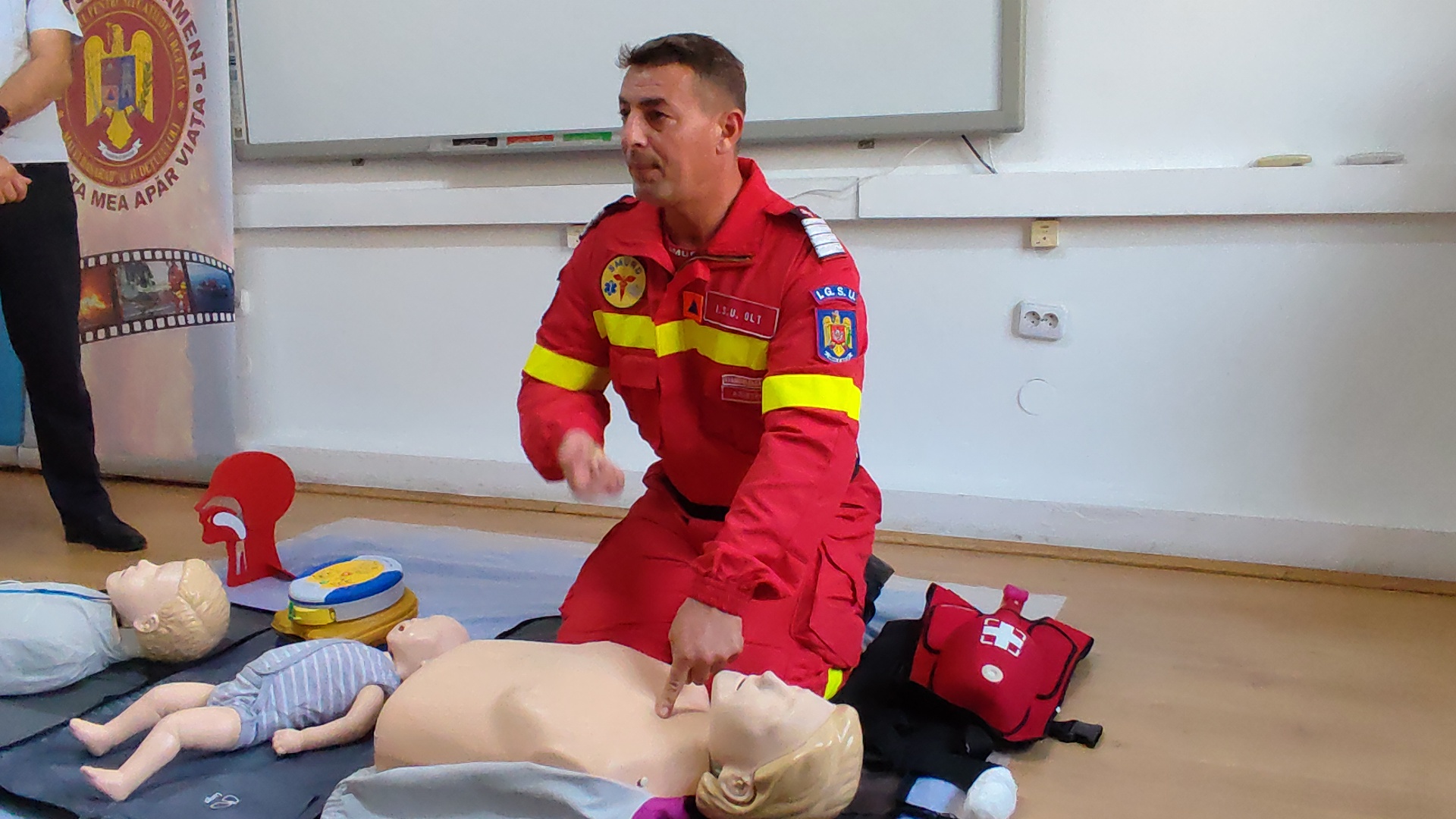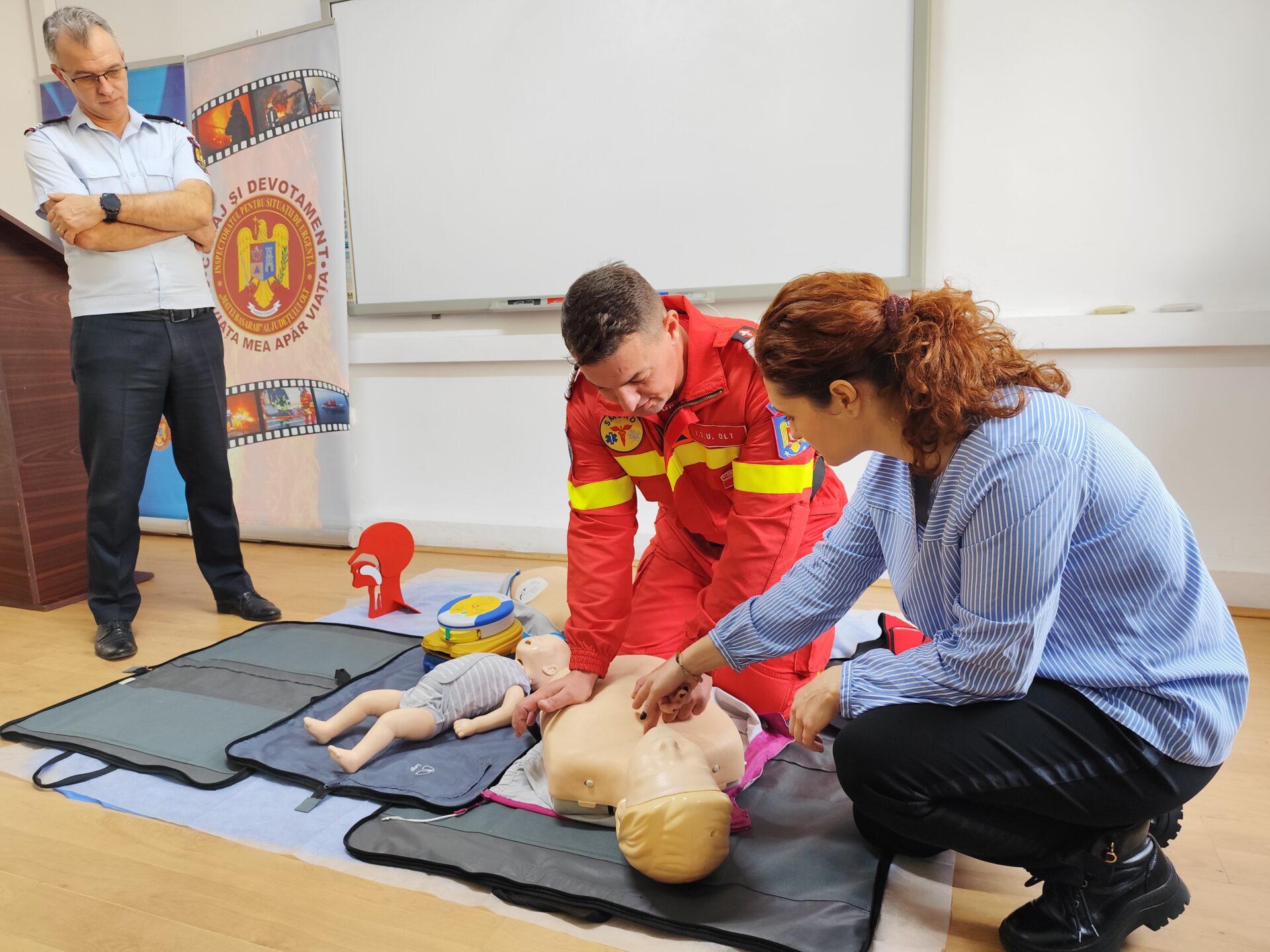 „Subiectul de astăzi (miercuri n.r.) este unul care va rămâne tot timpul de actualitate și se referă la modul în care putem acționa în cazul unei persoane care a suferit un stop cardio – respirator. Stopul cardio – respirator poate apărea oricând, oriunde și mai ales la oricine. Cu fiecare minut de la instalarea stopului cardio – respirator, dacă nu se acordă primul ajutor, șansele de supraviețuire ale victimei scad cu aproximativ 10%. Șansele la viață ale victimei cresc cu aproximativ 50 – 70 la sută dacă manevrele de resuscitare și defibrilare automată sunt realizate în primele 3 – 5 minute de la instalarea stopului cardio – respirator. Pentru că fiecare dintre noi poate contribui la creșterea șanselor de supraviețuire a unei persoane care a suferit un stop cardio – respirator, instituția noastră desfășoară permanent activități de informare și instruire a populației în ceea ce privește acordarea primului ajutor de bază. Sesiunile de instruire au fost desfășurate pe timpul activităților organizate de instituția noastră cu ocazia zilelor de armă, de Ziua Copilului, cu ocazia Zilei Internaționale pentru Reducerea Riscului la Dezastre, dar și la solicitarea unităților de învățământ, a instituțiilor publice sau operatorilor economici care și-au dorit ca angajații să cunoască manevrele de prim ajutor de bază. Programul de voluntariat ‘Salvator din pasiune’, care se desfășoară la nivel național, este o oportunitate prin care populația poate parcurge un curs de prim ajutor, cu durata de 40 de ore. Modulele de pregătire, fiind atât teoretice, cât și practice, se desfășoară sub coordonarea colegului nostru Cătălin Stănciuleasa, asistent medical principal SMURD Olt, și cu sprijinul paramedicilor și voluntarilor din cadrul ISU Olt. Programul ‘Salvator din pasiune’ se adresează tuturor cetățenilor care își doresc să parcurgă un curs de prim ajutor și au vârsta cuprinsă între 16 și 65 de ani, până în acest moment fiind organizate 15 serii de pregătire. Ne bucurăm pentru interesul pe care populația în acordă acestui program de voluntariat, iar faptul că peste 300 de persoane au parcurs modulul de prim ajutor, cu durata de 40 de ore, poate ajuta la creștere numărului de persoane salvate în prespital. Un alt proiect desfășurat la nivel național este de pregătire a polițiștilor, jandarmilor și personalului CFR, în acordarea primului ajutor de bază. În urma sesiunilor de pregătire, care au o durată de 16 ore, au fost instruiți 632 de polițiști, 249 de jandarmi și 45 de lucrători CFR”, a declarat inspectorul șef al ISU Olt.