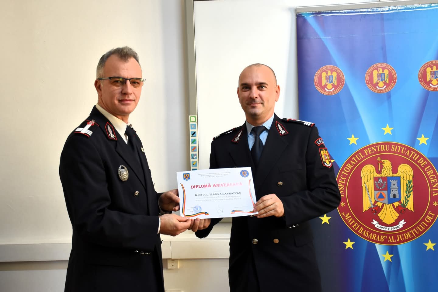 Pompierii din cadrul ISU Olt au marcat împlinirea a 20 de ani de la înființarea IGSU prin acordarea de diplome și insigne aniversare