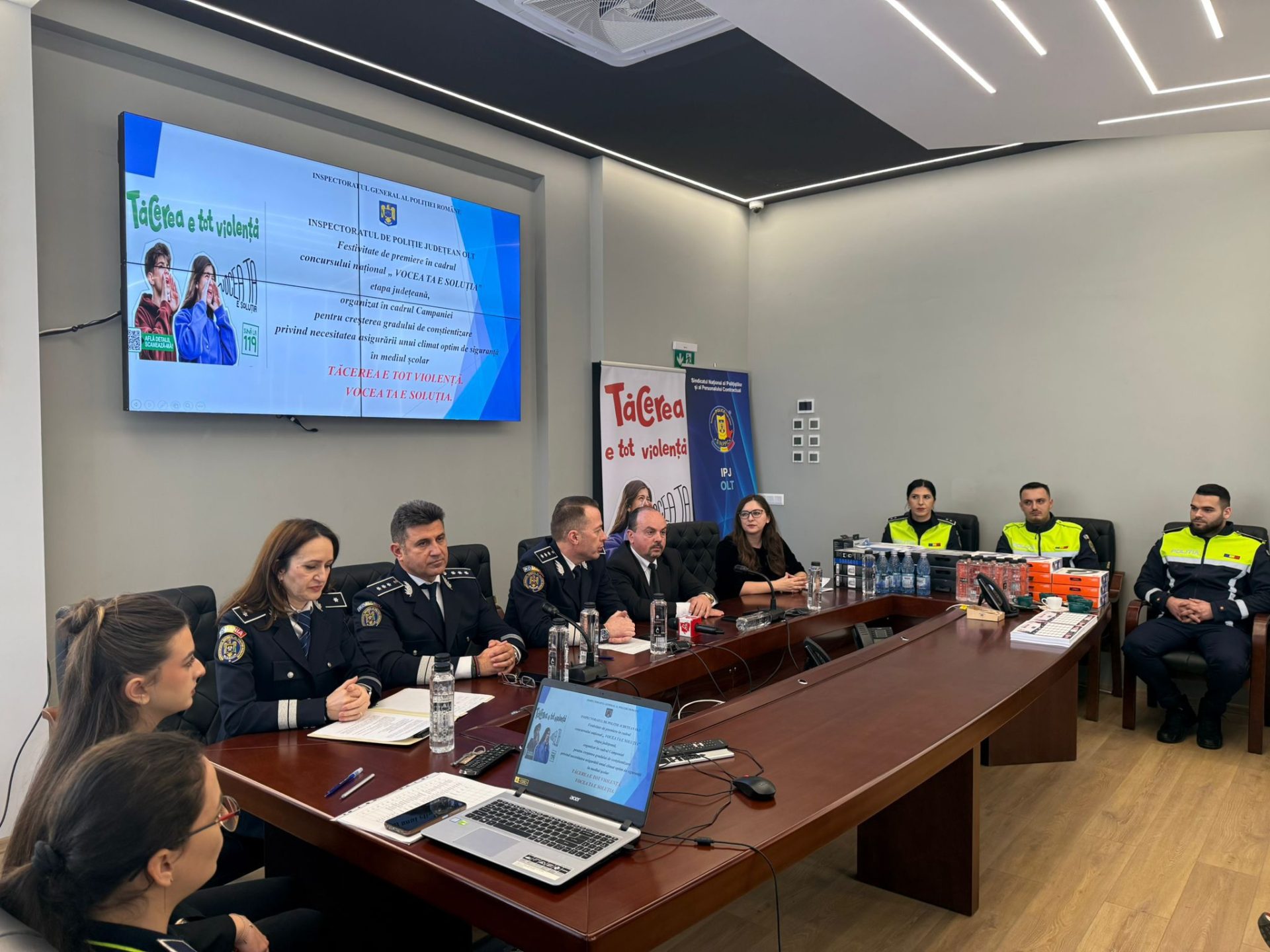 „Concursul, parte a Campaniei «Tăcerea e tot violență. Vocea ta e soluția», a avut ca obiectiv creșterea gradului de conștientizare cu privire la siguranța în mediul școlar și încurajarea elevilor să transmită mesaje puternice privind prevenirea violenței școlare, respectiv prevenirea și combaterea consumului de substanțe interzise. Participarea a fost impresionantă, elevii din județul Olt demonstrând creativitate, gândire critică și dorința de a contribui activ la construirea unui mediu școlar sigur. Proiectele înscrise – short-uri/reel-uri realizate de echipe mixte – au fost evaluate de un juriu format din reprezentanți ai Biroului Siguranța Școlară și parteneri din domeniul educațional și social”, a declarat agentul principal Ionuț Mitrică, purtător de cuvânt al Poliției Olt.
