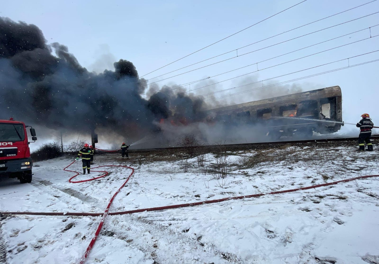 UPDATE 3: Pompierii olteni au stabilit cauza probabilă a izbucnirii incendiului ca fiind un scurtcircuit electric la tabloul de siguranțe al vagonului afectat de incendiu în proporție de aproximativ 90 la sută.