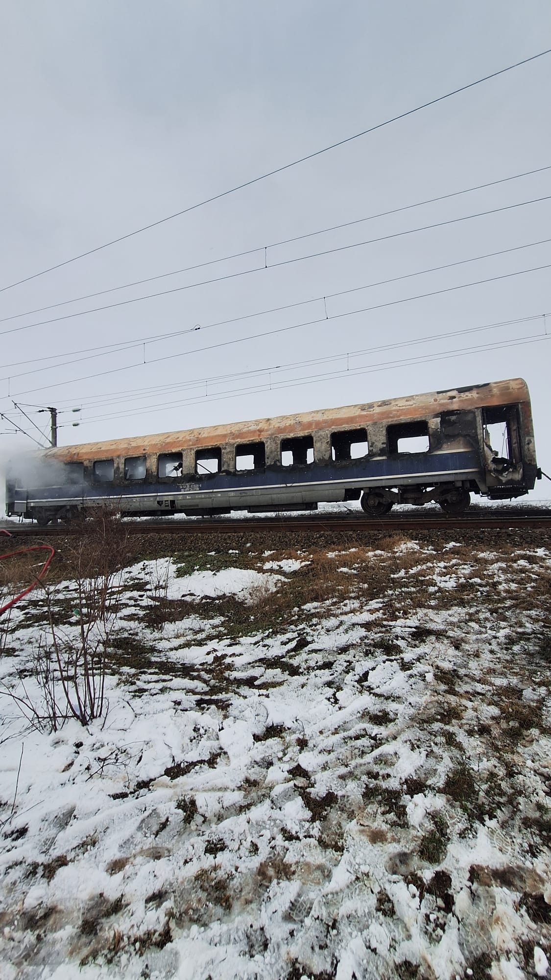 Ultimul vagon al trenului de călători InterRegio 1823, cuprins de flăcări, în zona comunei Radomirești. Un tânăr a avut nevoie de îngrijiri medical, iar Planul Roșu a fost activat