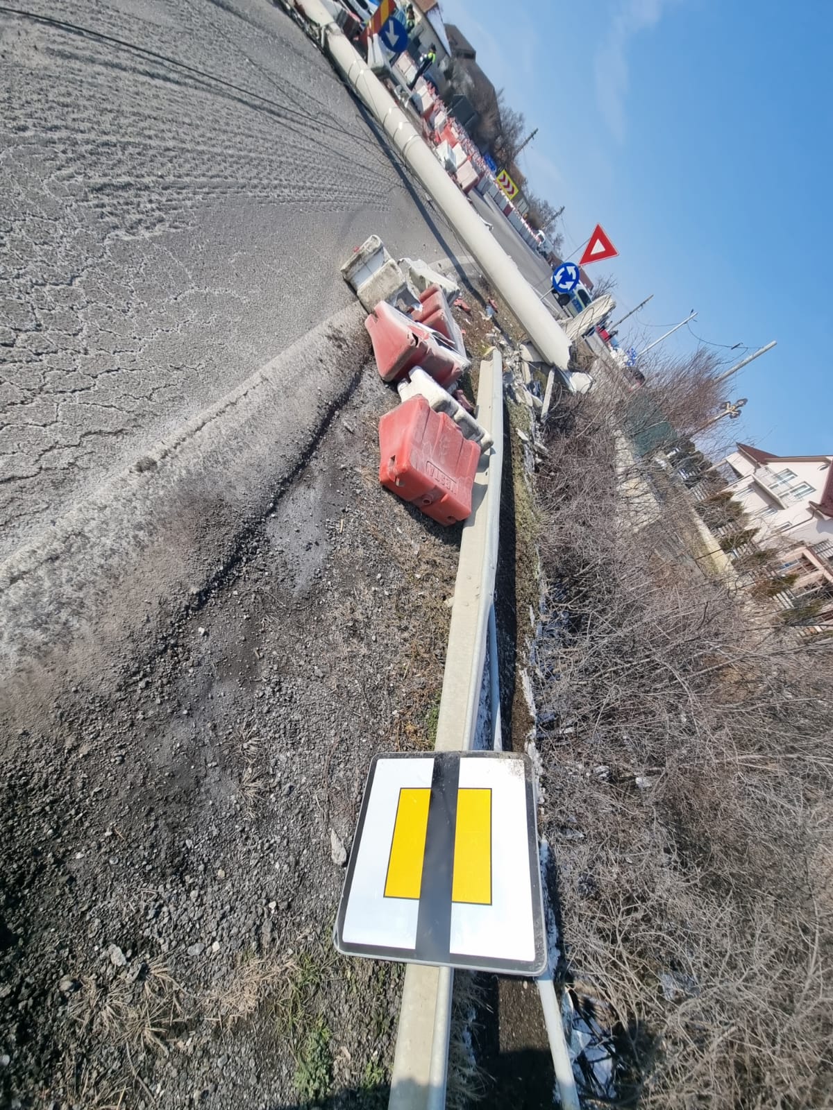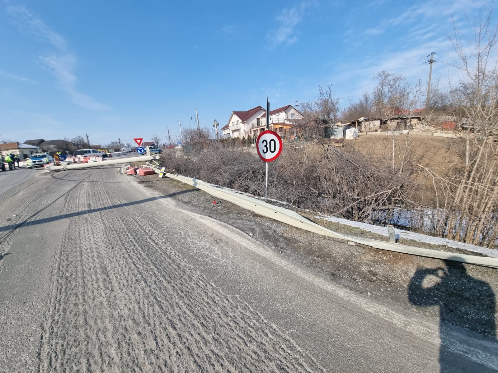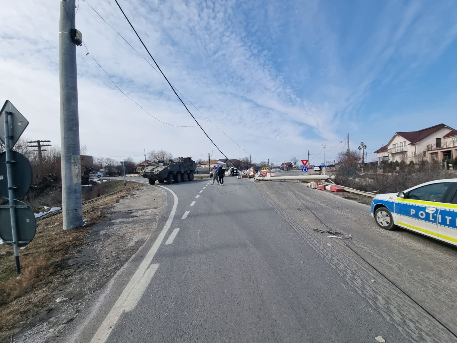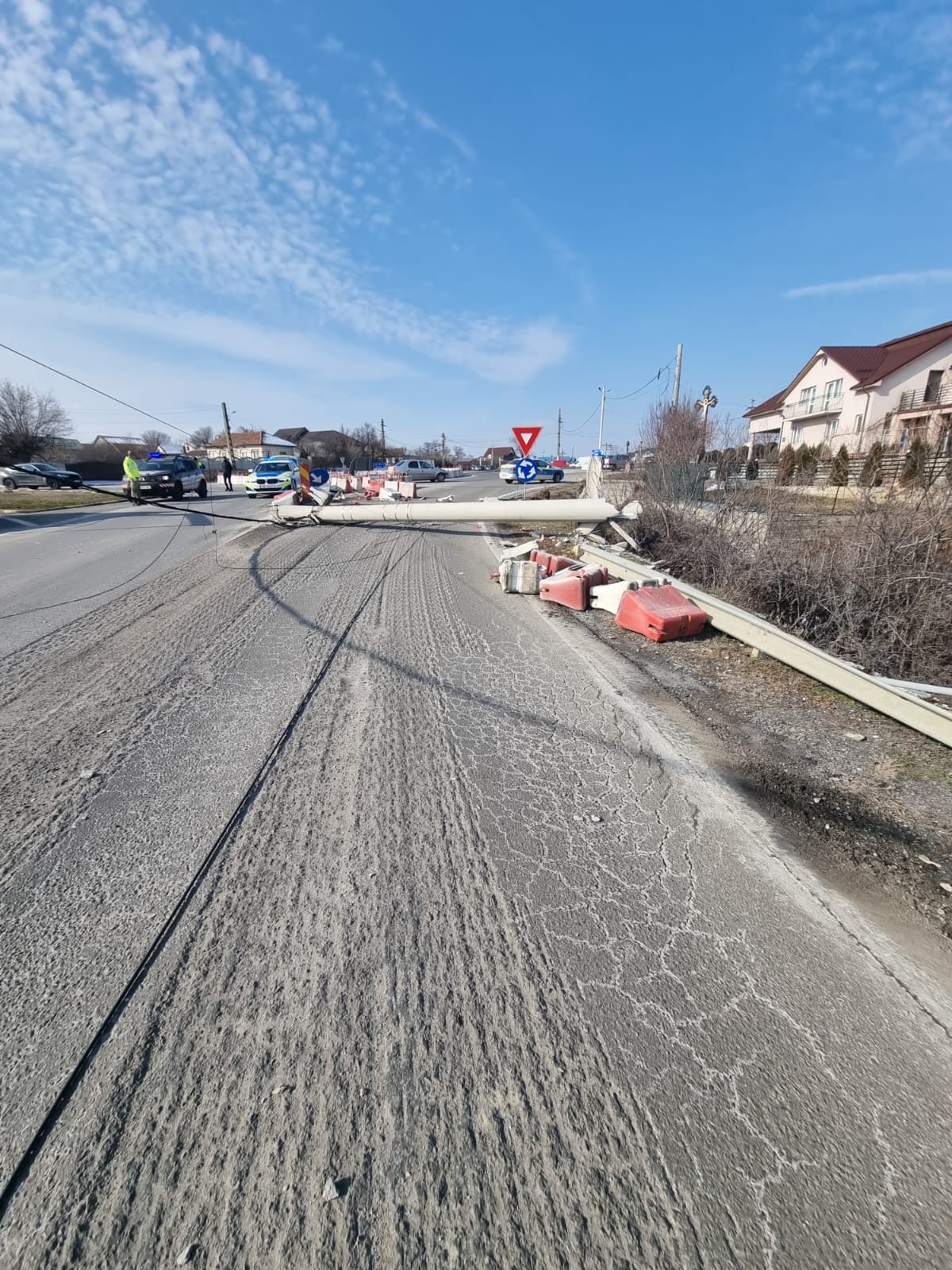 UPDATE: În jurul orei 15:40, circulația rutieră a fost reluată pe un sens, dirijat, stâlpul de electricitate fiind tras de pe carosabil.