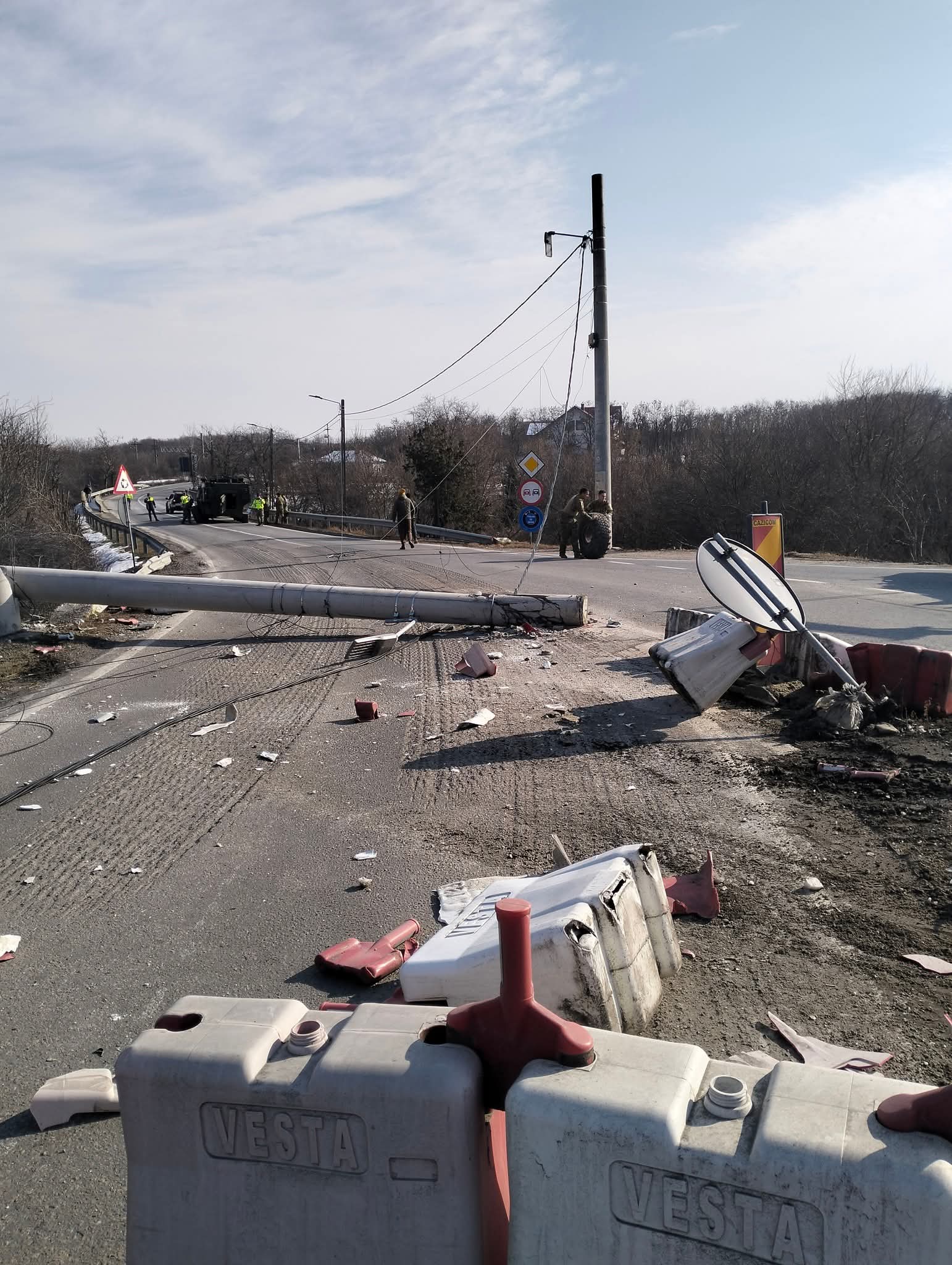 Stâlp de curent electric rupt de un transportator blindat aflat într-un convoi militar, în sensul giratoriu de la Găneasa