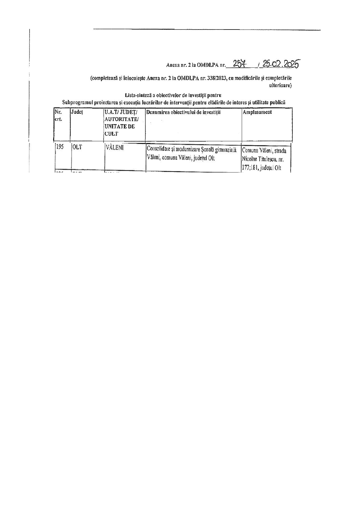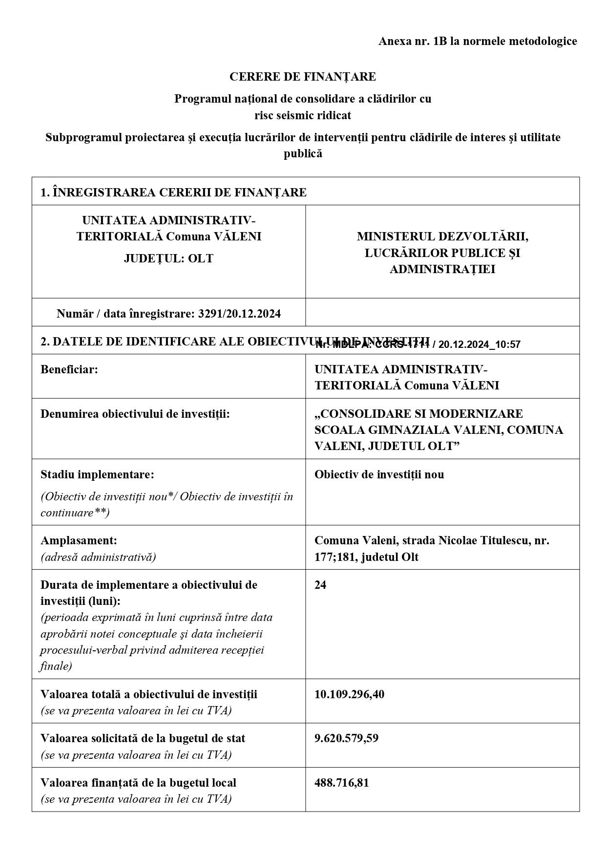 „Cererea de finanţare depusă pentru obiectivul de investiţii «Consolidare și modernizare Școală Gimnazială Văleni, comuna Văleni, județul Olt», prin Programul național de consolidare a clădirilor cu risc seismic ridicat, a fost declarată eligibilă de către Ministerul Dezvoltării, Lucrărilor Publice și Administrației, urmând a se încheia contractul de finanţare, valoarea totală a obiectivului de investiţii fiind de 10.109.296,40 lei cu TVA. De asemenea, am depus la Ministerul Educaţiei o solicitare de a include în Programul Național de Investiții «Școli sigure și sănătoase» a clădirii sala de sport a Liceului Tehnologic Văleni pentru putea demara lucrările pentru «Consolidare şi modernizare sală de sport – Liceul Tehnologic Văleni, comuna Văleni, judeţul Olt»”, a declarat edilul Ion Belu.