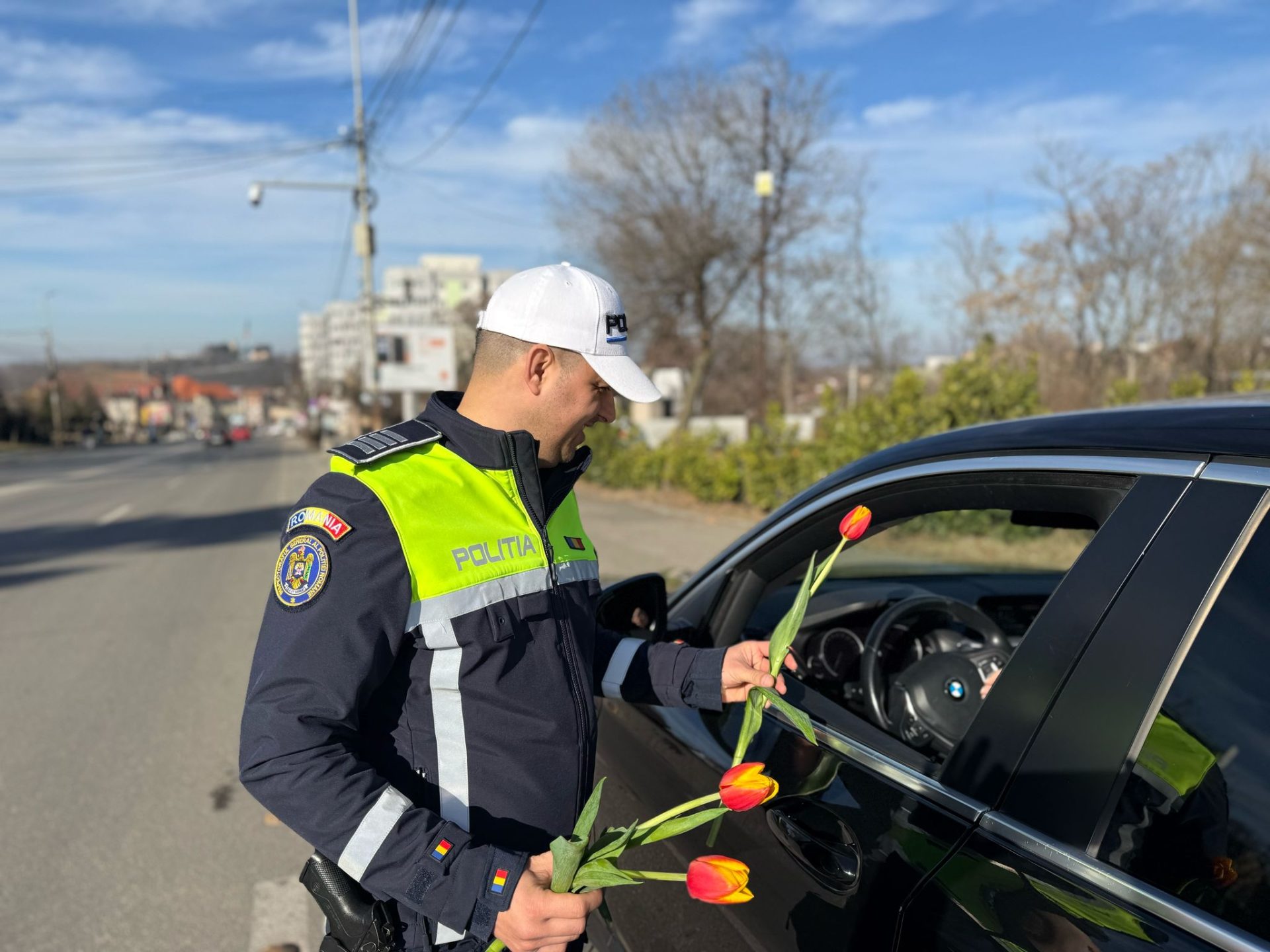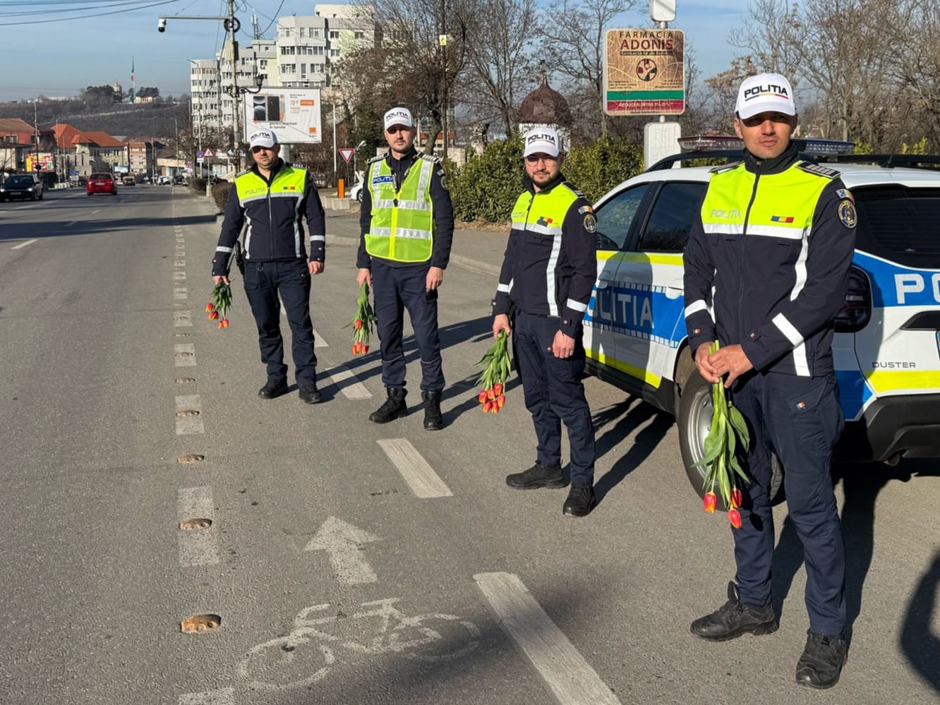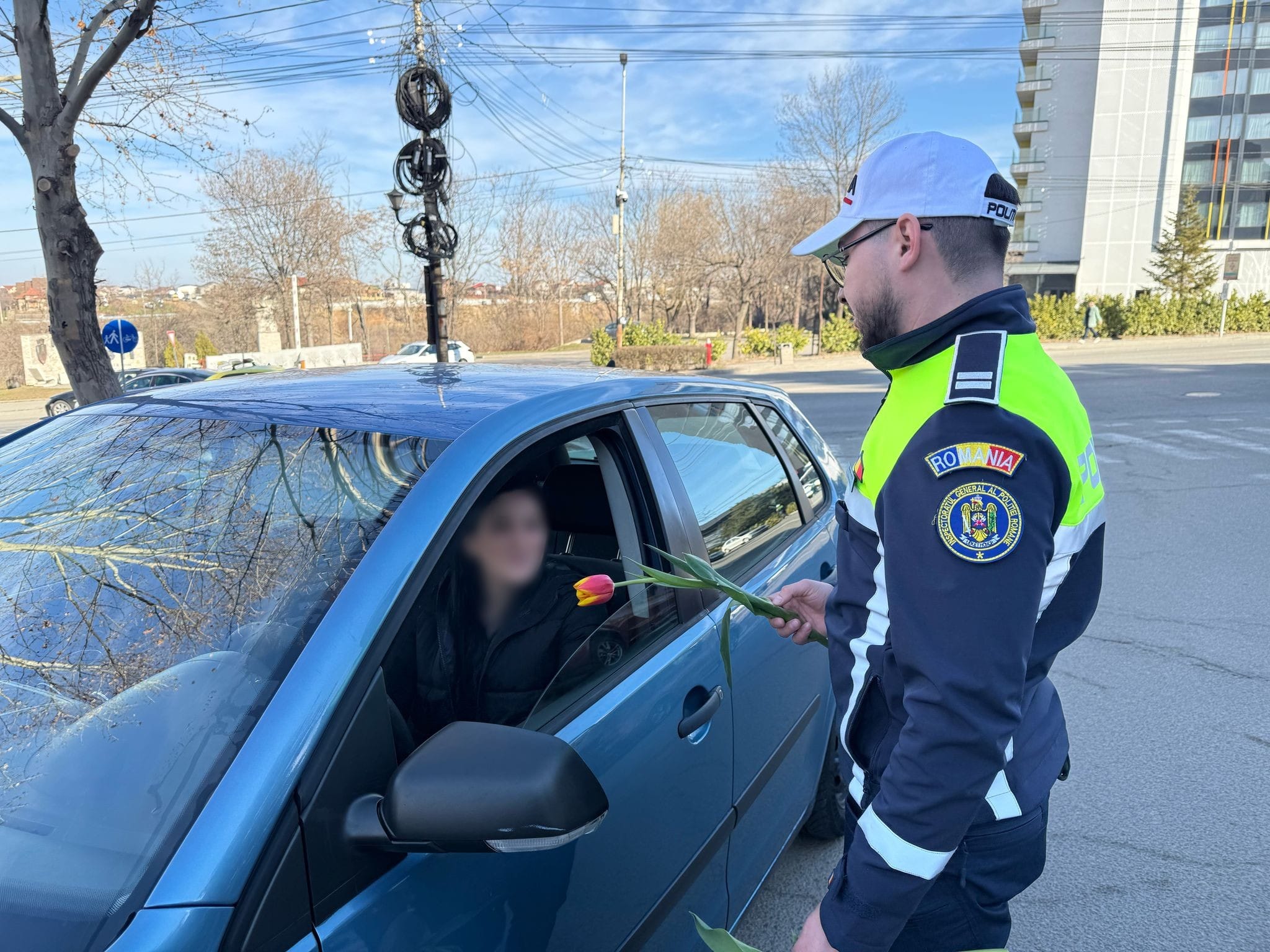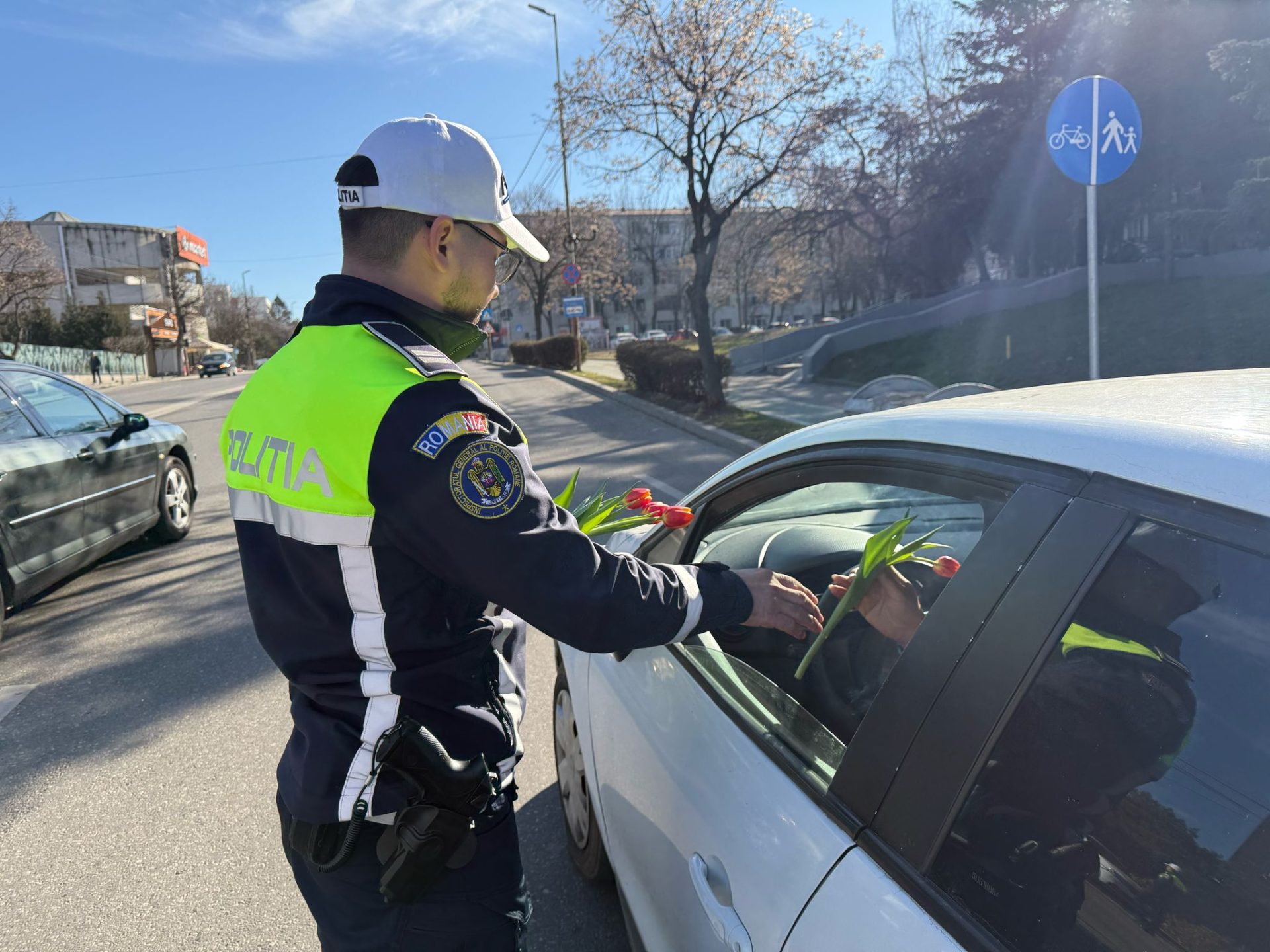 Doamnele și domnișoarele șoferițe oprite, nu au fost sancționate contravențional, ci surprinse plăcut cu flori și urări de bine, ca semn de respect și apreciere cu ocazia zilei dedicată lor.