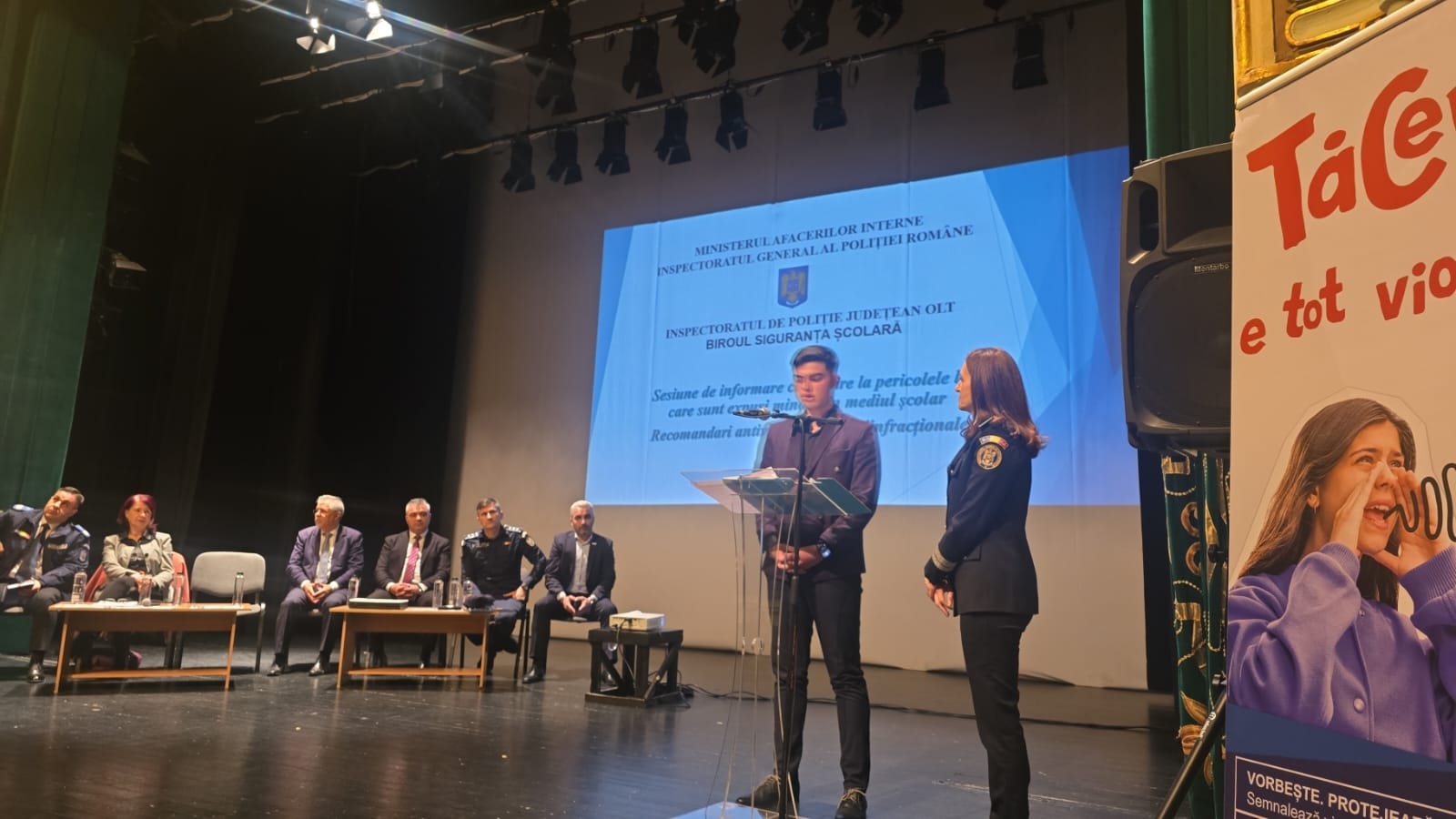 Polițiștii Biroului de Siguranță Școlară din cadrul Inspectoratului de Poliție Județean Olt, împreună cu partenerii instituționali, au organizat miercuri după-amiază, în sala de spectacole a Teatrului Național „Ștefan Iordache”, din municipiul Caracal, o activitate dedicată campaniei naționale „Tăcerea e tot violență. Vocea ta e soluția”.