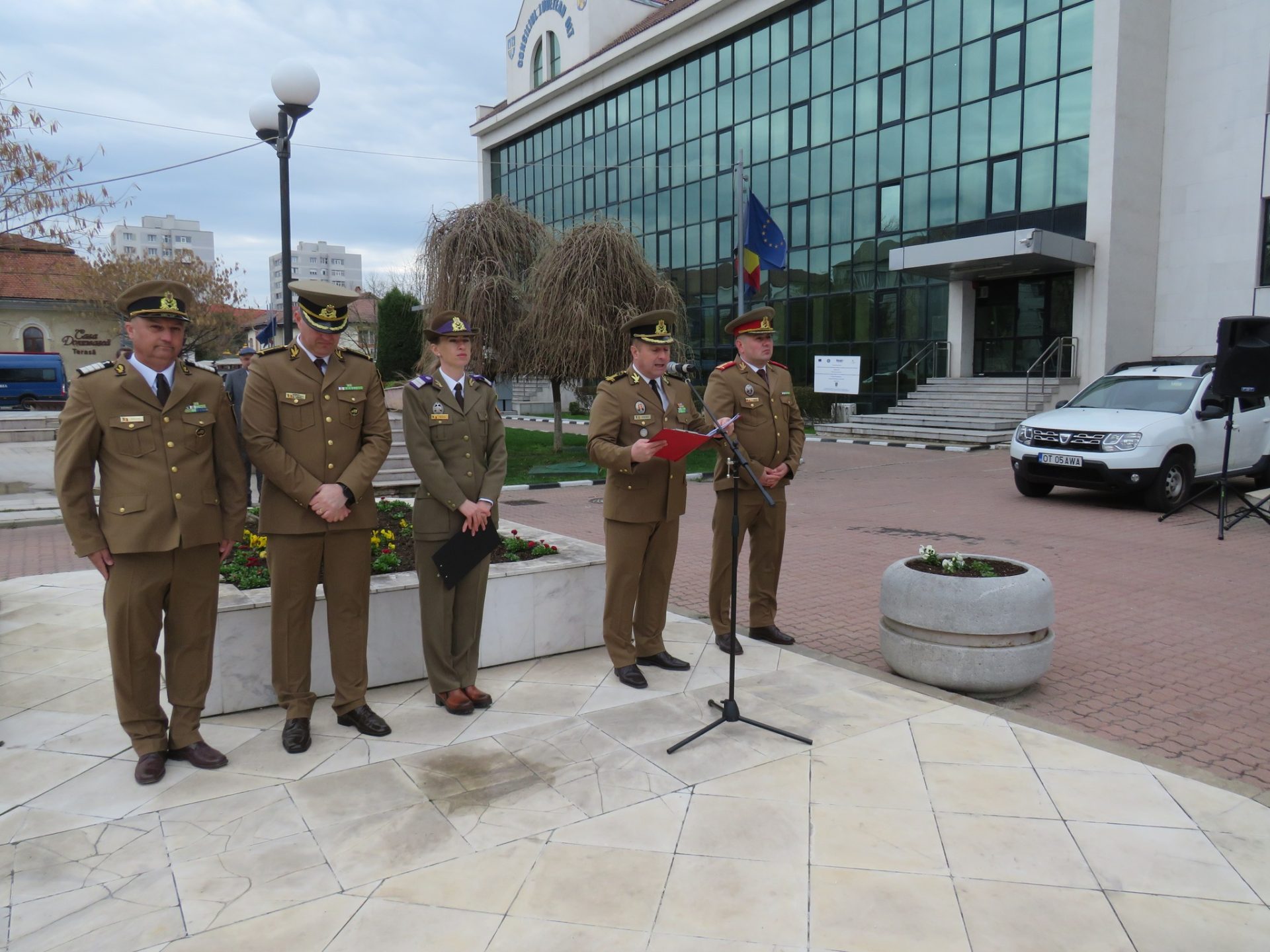 În cadrul manifestării, prefectul județului Cosmin Floreanu, primarul Slatinei și colonel Daniel Pescaru, comandantul Centrului Militar Județean Olt, au rostit alocuțiuni despre semnificația acestei zile, ceremonia încheindu-se cu defilarea Gărzii de Onoare, alcătuită din garda drapelului, pompieri, jandarmi și militari, prin fața oficialităților, pe acordurilor cântecelor patriotice interpretate de Fanfara Lyra Band.