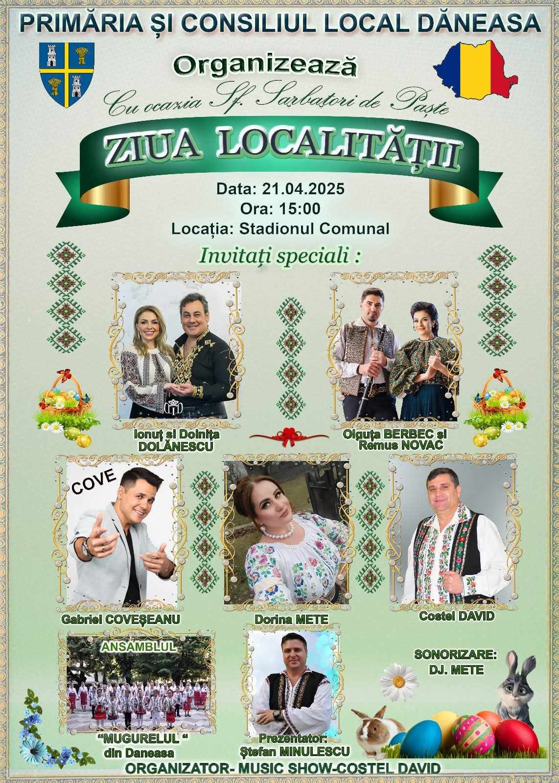 Vor evolua în spectacolul organizat de Music Show – Costel David, sonorizarea fiind asigurată de DJ Mete, Ansamblul Folcloric „Mugurelul” din Dăneasa, Ionuț și Doinița Dolănescu, Olguța Berbec și Remus Novac, Gabriel Coveșeanu – COVE, Dorina Mete și Costel David, iar prezentator este Ștefan Minulescu.