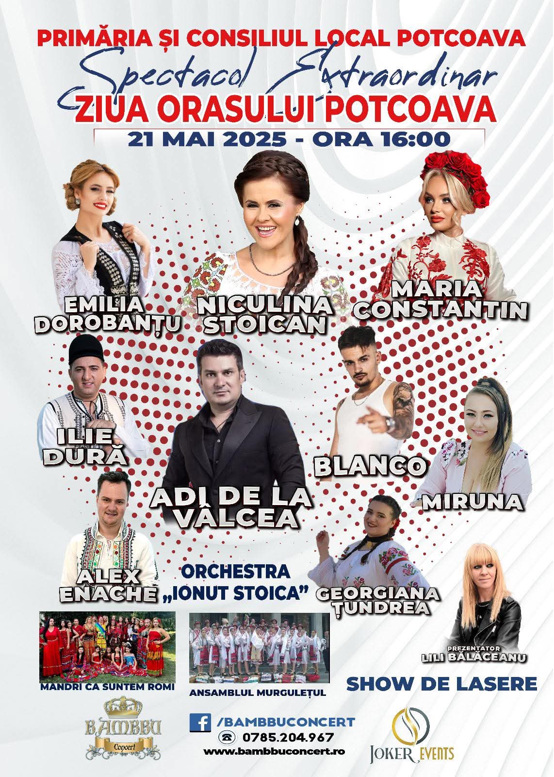 Primăria și Consiliul Local Potcoava organizează spectacolul extraordinar dedicat Zilei Orașului, începând cu ora 16:00 a după-amiezii zilei de miercuri, 21 mai.