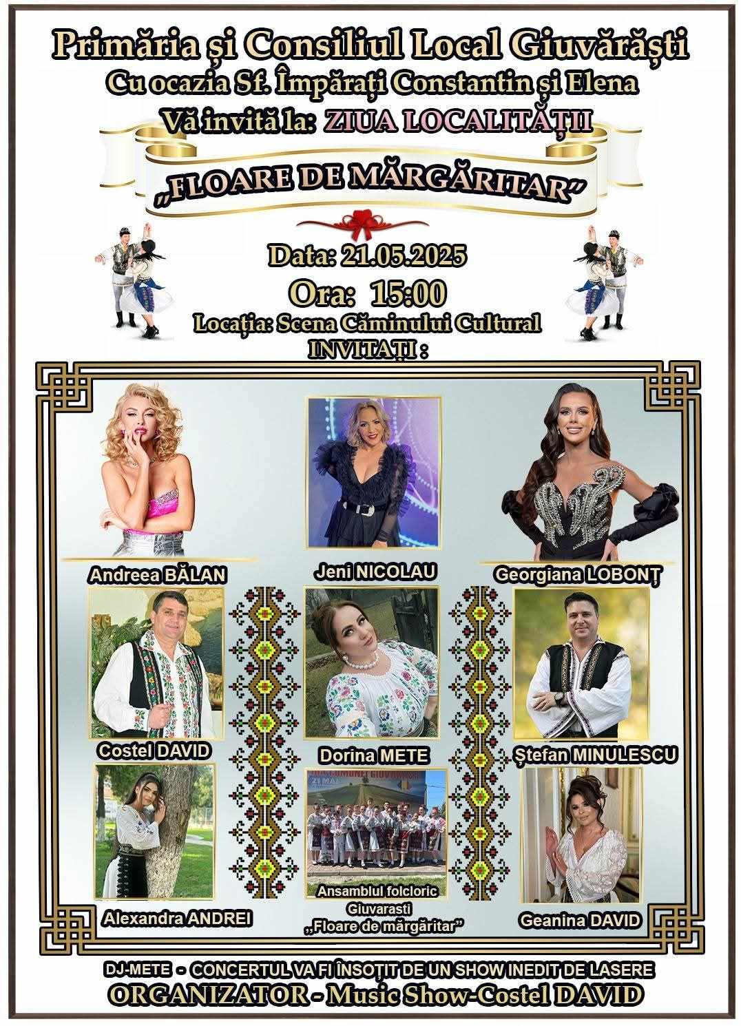 Scena Căminului Cultural este locul în care va avea loc în aceeași zi de 21 mai și Ziua localității Giuvărăști, organizată cu începere de la ora 15:00 de Primăria și Consiliul Local. Sub titulatura de „Floare de mărgăritar” vor urca într-un spectacol inedit Andreea Bălan, Jeni Nicolau, Georgiana Lobonț, Costel David, Dorina Mete, Ștefan Minulescu, Alexandra Andrei, Geanina David și Ansamblul folcloric „Floare de mărgăritar” al localității. Întreg evenimentul va culmina cu un superb show de lasere.