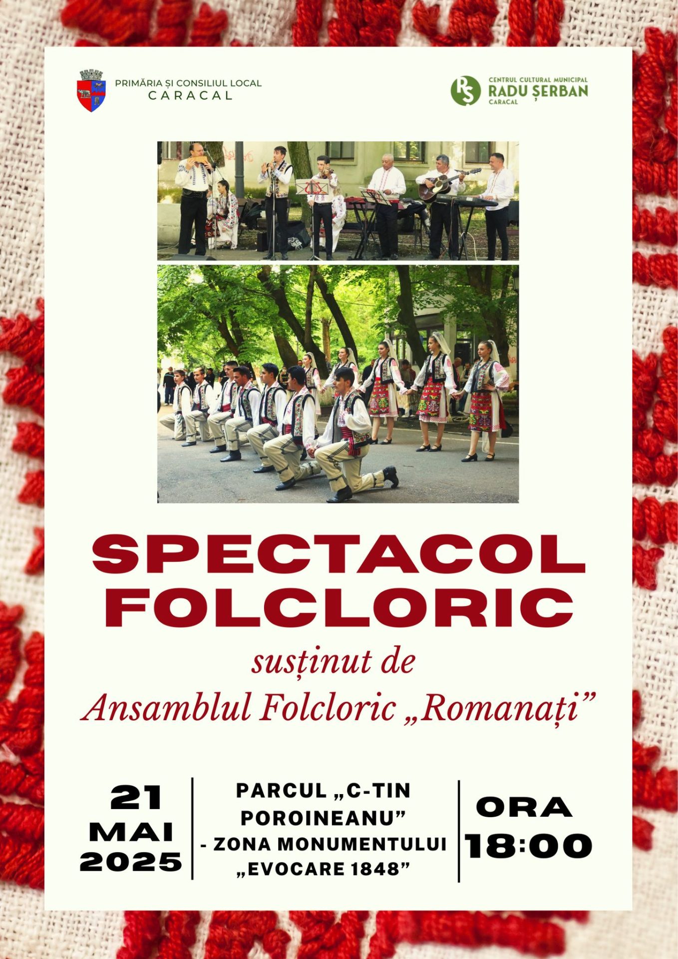 „Vă invităm să petreceți o seară în care tradiția prinde viață sub cerul liber, în inima parcului. Jocul popular, muzica live și portul românesc autentic vor crea atmosfera de sărbătoare care ne va aduce împreună. Haideți să sărbătorim românește, cu voie bună!”, este invitația adresată de reprezentanții Centrului Cultural Municipal „Radu Șerban” din municipiul Caracal la spectacolul membrilor Ansamblului Folcloric Romanați.
