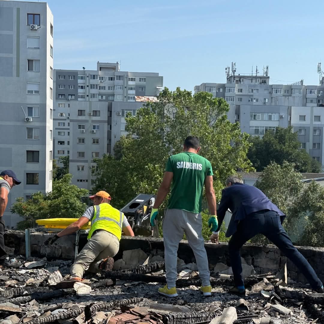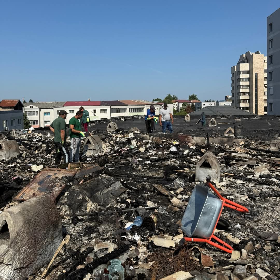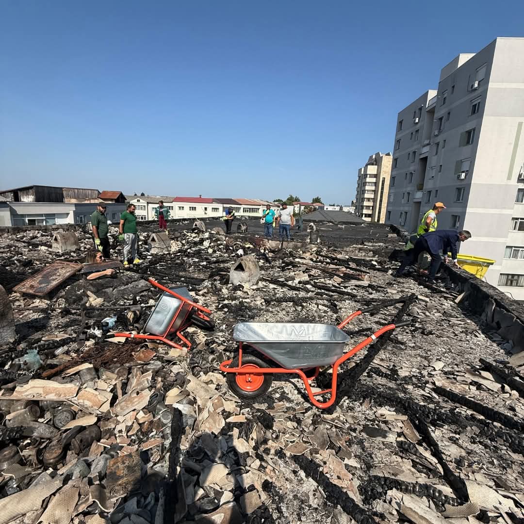 Mai multe echipe ale Primăriei, inclusiv cele de la salubritate, au intervenit luni, încă de la primele ore ale dimineții, pentru a curăța mizeria rămasă după incendiu.