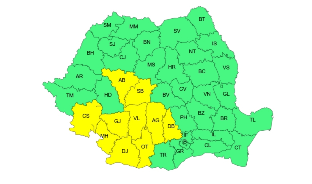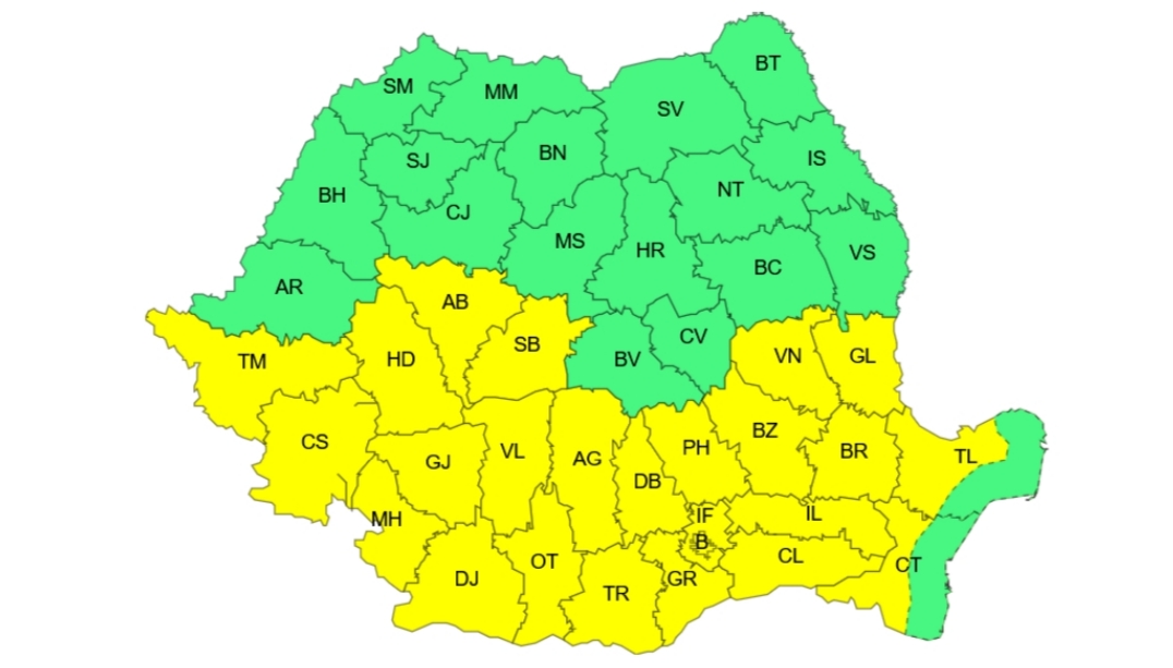 Primul Cod galben este de temperaturi deosebit de ridicate, local caniculă, fiind valabil luni, în intervalul orar 12:00 – 21:00: „În sudul Banatului, Oltenia, nord-vestul Munteniei şi sud-vestul Transilvaniei, se vor înregistra temperaturi deosebit de ridicate pentru această dată (maxime de 34…36 de grade) și local va fi caniculă”.