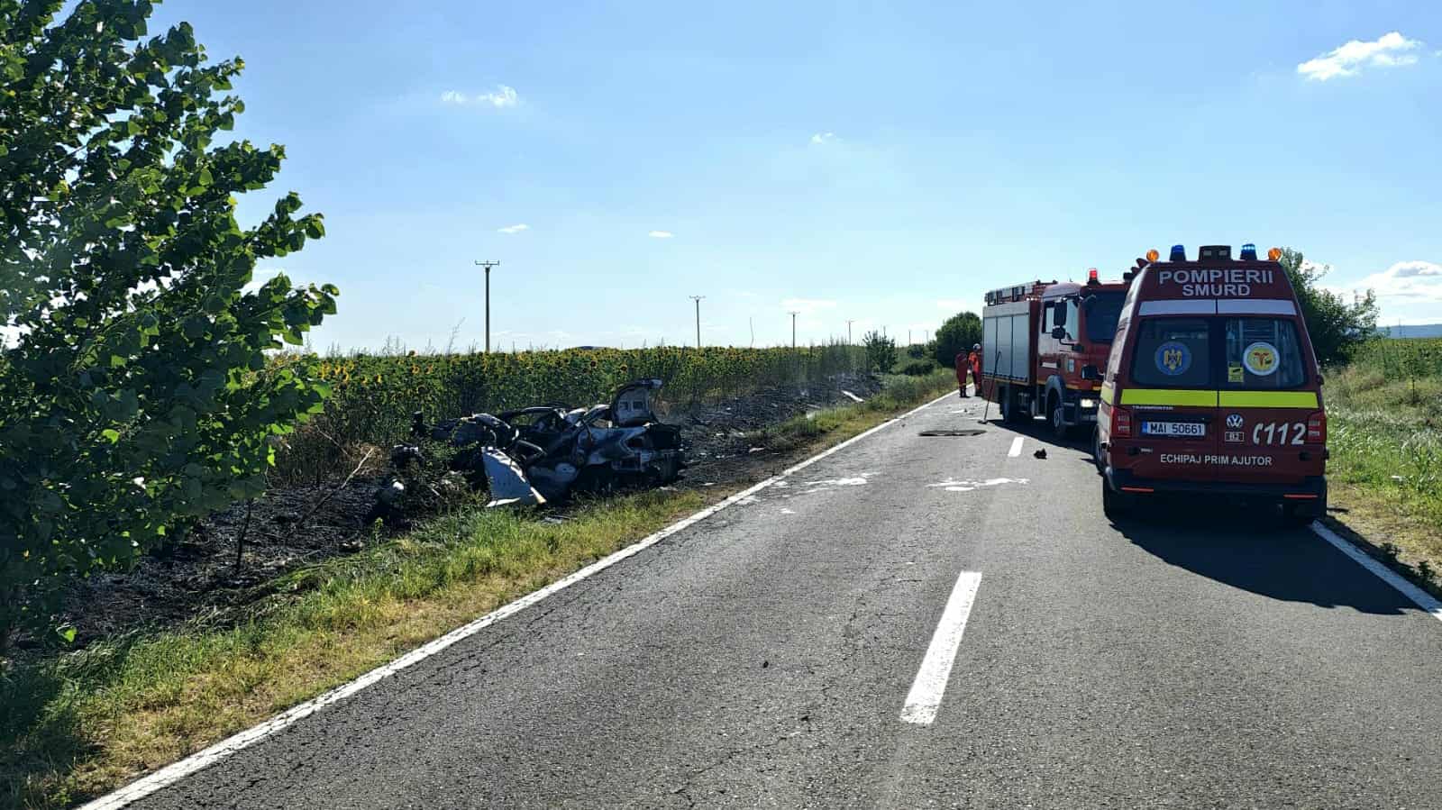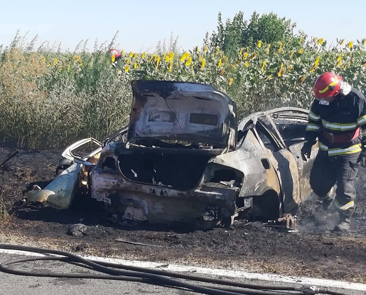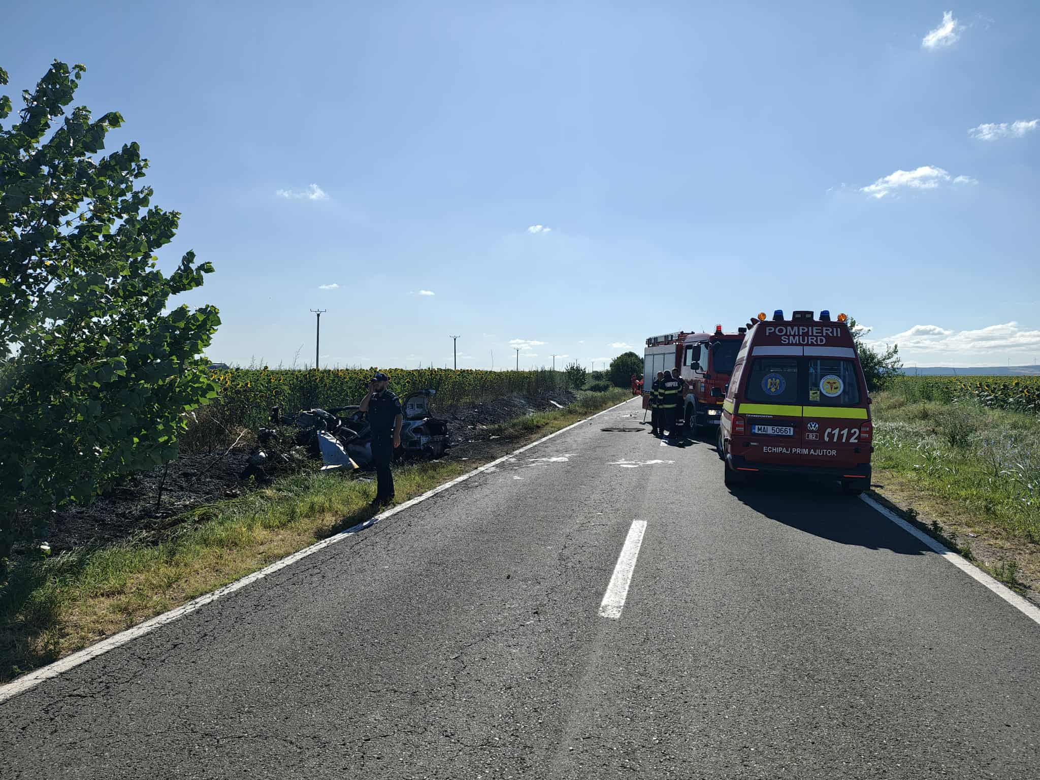 Una dintre cele două mașini implicate în accident a luat foc în urma impactului, una dintre victimele care a murit fiind găsită încarcerată între fiarele contorsoniate ale vehiculului în care se afla.