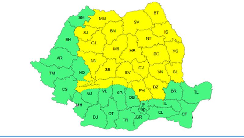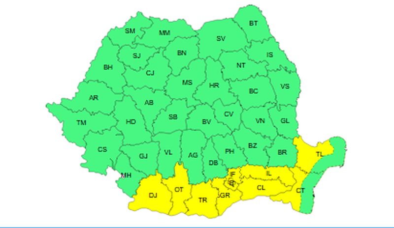 Însă, pe parcursul zilei de miercuri, în intervalul orar 10:00 – 22:00, este în vigoare și un Cod galben de instabilitate atmosferică temporar accentuată.