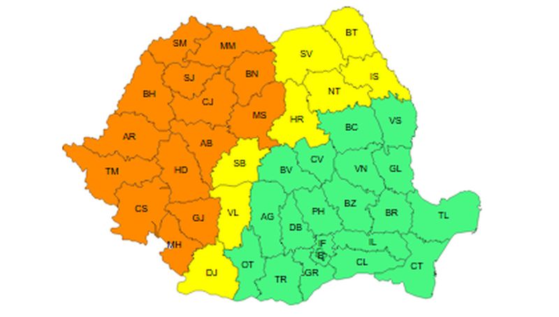 Iar de sâmbătă, la ora 17:00, și până pe parcursul zilei de sâmbătă spre duminică, 26 spre 27 iulie, ora 00:00, va fi în vigoare un Cod portocaliu de vijelii puternice și instabilitate atmosferică accentuată.