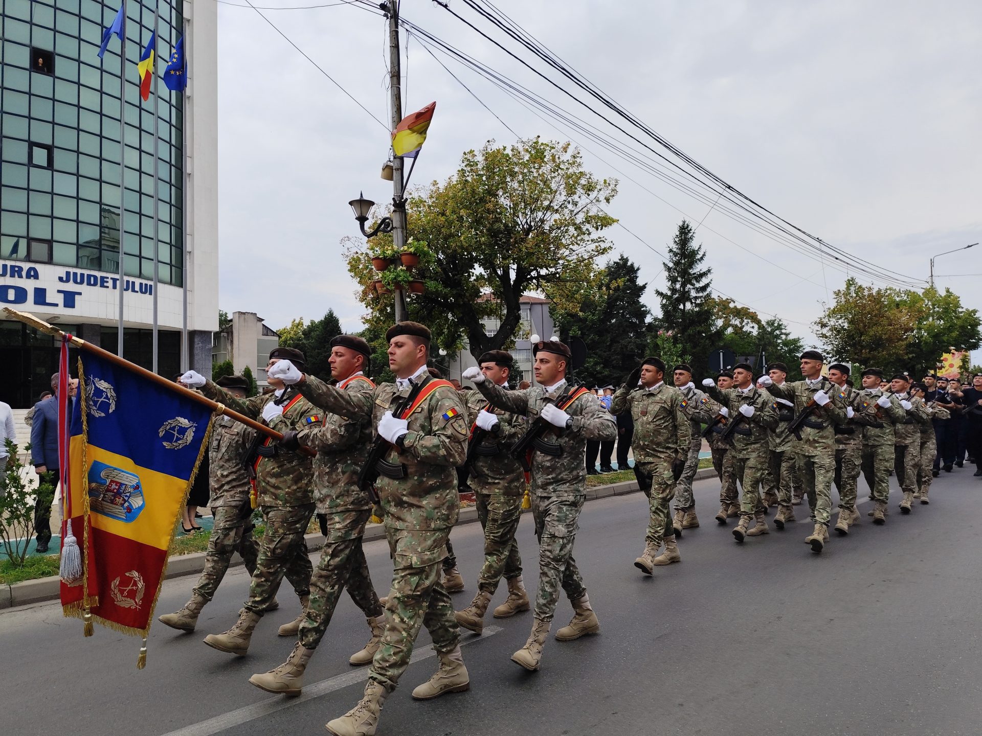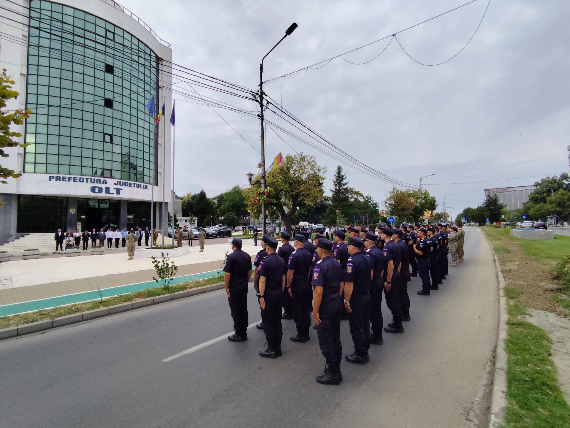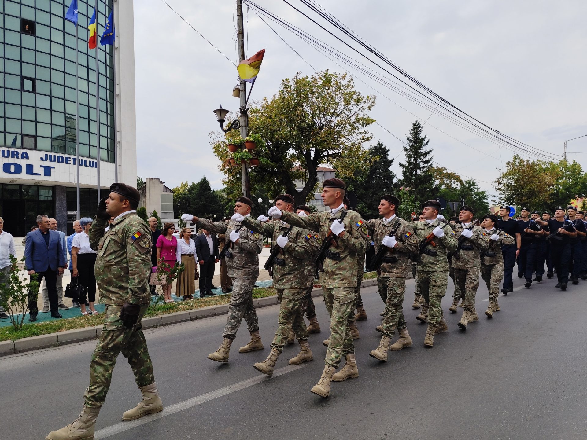 Evenimentul a fost completat și de intonarea imnului național al României, așa cum au spus și reprezentanții CJ Olt, de către Ana Burciu, actualmente solistă în cadrul Ansamblului Folcloric „Doina Oltului” al Centrului Județean de Cultură și Artă Olt, pe acordurile căruia pe catargul din fața Prefecturii a fost arborat steagul României, pentru ca la finalul ceremonialului garda de onoare, alcătuită din militari, jandarmi și pompieri, să defileze prin fața oficialităților.