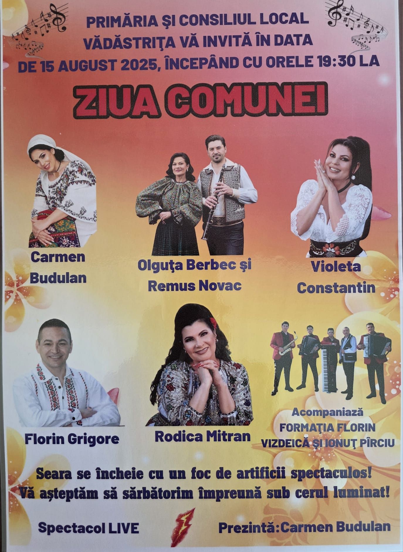 Ceilalți artiști care vor urca pe scenă sunt Florin Grigore, originar din comuna olteană Obârșia, și Rodica Mitran, acompaniamentul muzical fiind asigurat de Florin Vizdeică și Ionuț Pîrciu, prezentator fiind îndrăgita Carmen Budulan de la Corabia.