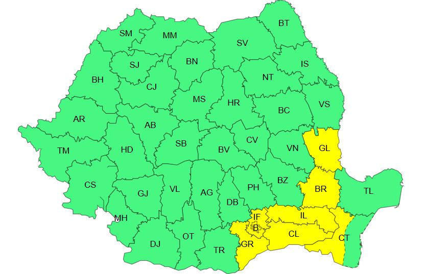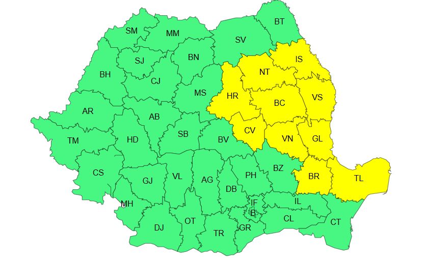 De la ora 12:00 și până la 21:00, va fi în vigoare un Cod galben de instabilitate atmosferică: „În nordul Crișanei, Maramureș, Transilvania, Oltenia, Moldova, Muntenia și Dobrogea vor fi perioade cu instabilitate atmosferică ce se va manifesta prin averse torențiale, descărcări electrice, intensificări ale vântului, vijelii (rafale de 50…70 km/h, iar în regiunile sudice, temporar peste 80 km/h) și pe arii restrânse grindină de mici și posibil medii dimensiuni (1 – 3 cm). În intervale scurte de timp și prin acumulare, cantitățile de apă vor fi de 20…30 l/mp și izolat de peste 40…50 l/mp”.
