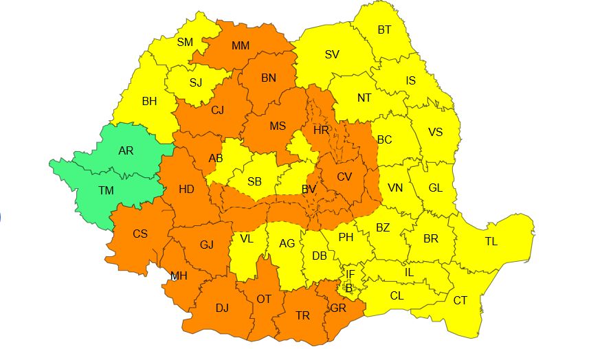 „În județele Caraș Severin, Hunedoara, Cluj, Mureș, Bistrița Năsăud, Maramureș, Covasna, precum și la munte vor fi averse importante cantitativ, frecvente descărcări electrice, intensificări ale vântului (rafale de 50…70 km/h) și grindină de medii dimensiuni (3 – 4 cm). În intervale scurte de timp sau prin acumulare, cantitățile de apă vor fi de 40…50 l/mp și izolat de peste 60 l/mp”, anunță ANM.