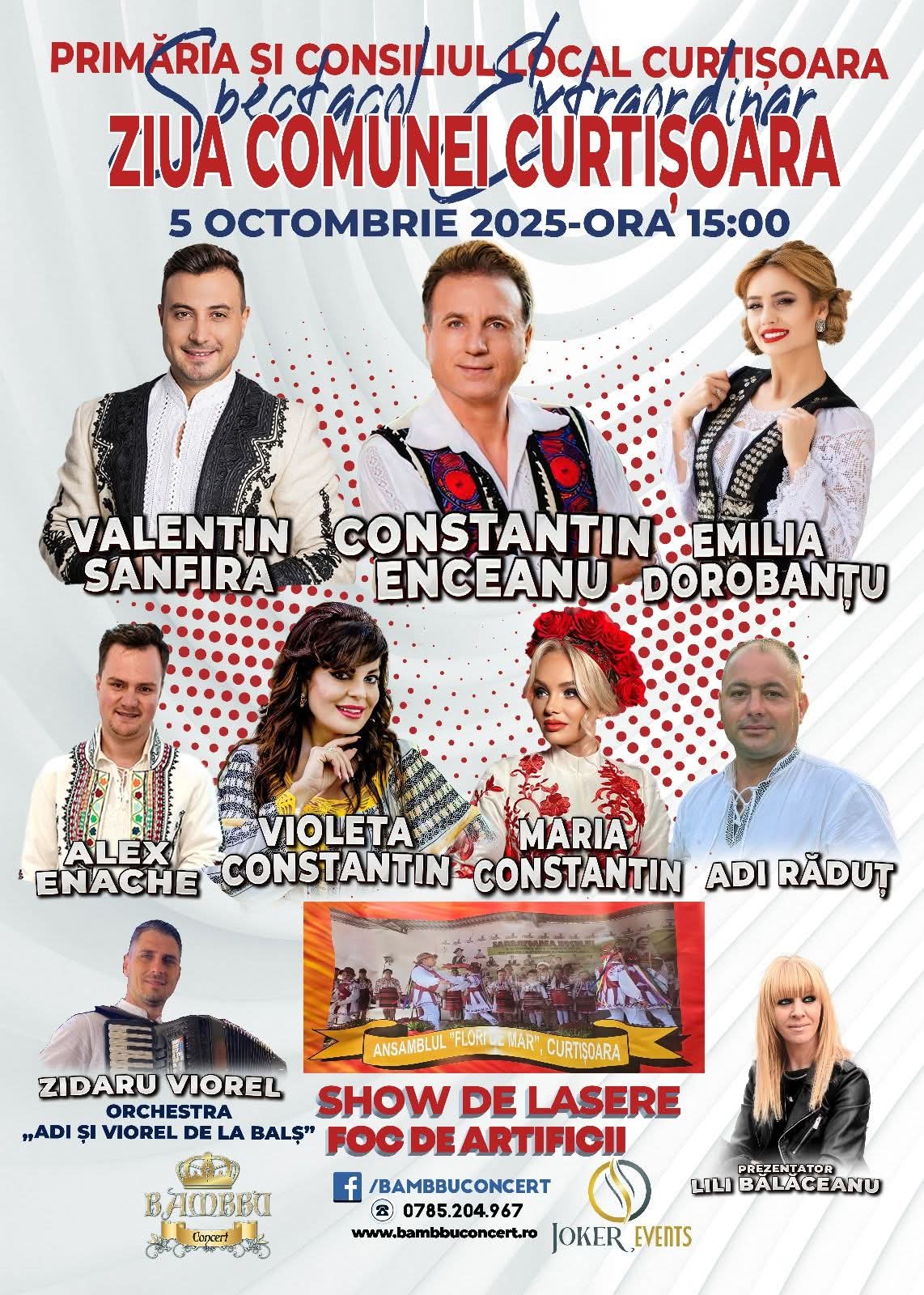 Așadar, apoi, pe scenă vor susține frumoase recitaluri îndrăgita interpretă de muzică populară Emilia Dorobanţu, originară din Curtişoara, precum și Valentin Sanfira, Constantin Enceanu, Alex Enache, Violeta Constantin, Maria Constantin, Adi Răduț, acordeonistul Viorel Zidaru, acompaniamentul muzical fiind asigurat de Orchestra „Adi și Viorel de la Balș”