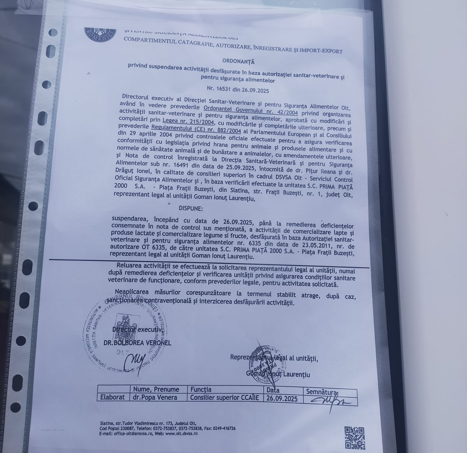 Venera Popa, purtător de cuvânt al DSVSA Olt, a declarat că au fost identificate o serie de abateri de la normele sanitar-veterinare, pentru care a fost aplicată administratorului piețelor o amendă în cuantum de 20.000 lei, conform Hotărârii Guvernului 984 din 2005, cu modificările și completările ulterioare, și ca sancțiune complementară, suspendarea activității Pieței Agroalimentare Zahana, începând de joi, 25 septembrie, și a Pieței Agroalimentare „Frații Buzești”, începând de vineri, 26 septembrie 2025.
