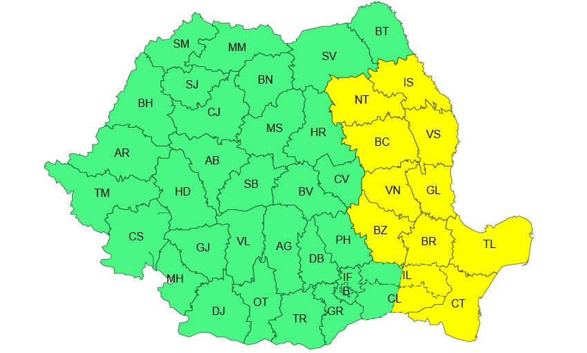 Un cod galben de ploi însemnate cantitativ va afecta de joi, ora 10:00, și până vineri, ora 23:00, centrul și estul Munteniei și Dobrogea: „În intervalul menționat vor fi ploi însemnate cantitativ în centrul și estul Munteniei și în Dobrogea. Cantitățile de apă vor fi de 25…35 l/mp și local de 40…50 l/mp”.