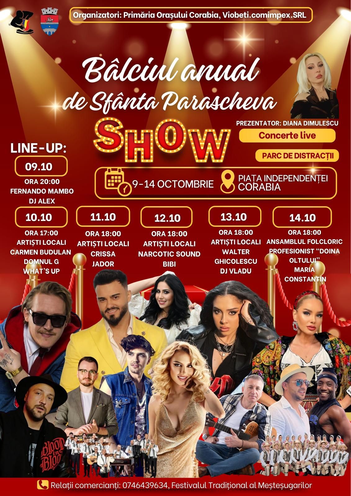 Luni, 13 octombrie, începând cu ora 18:00, sunt în recital artiști locali, Walter Ghicolescu și Dj Vladu, iar în ultima zi a bâlciului anual de la Corabia, adică marțea viitoare, 14 octombrie, tot de la ora 18:00, vor fi într-un spectacol extraodinar membrii Ansamblului Folcloric „Doina Oltului” de la Slatina al Centrului Județean de Cultură și Artă Olt, instituție subordonată Consiliului Județean Olt,  dar și îndrăgita interpretă de muzică populară Maria Constantin.