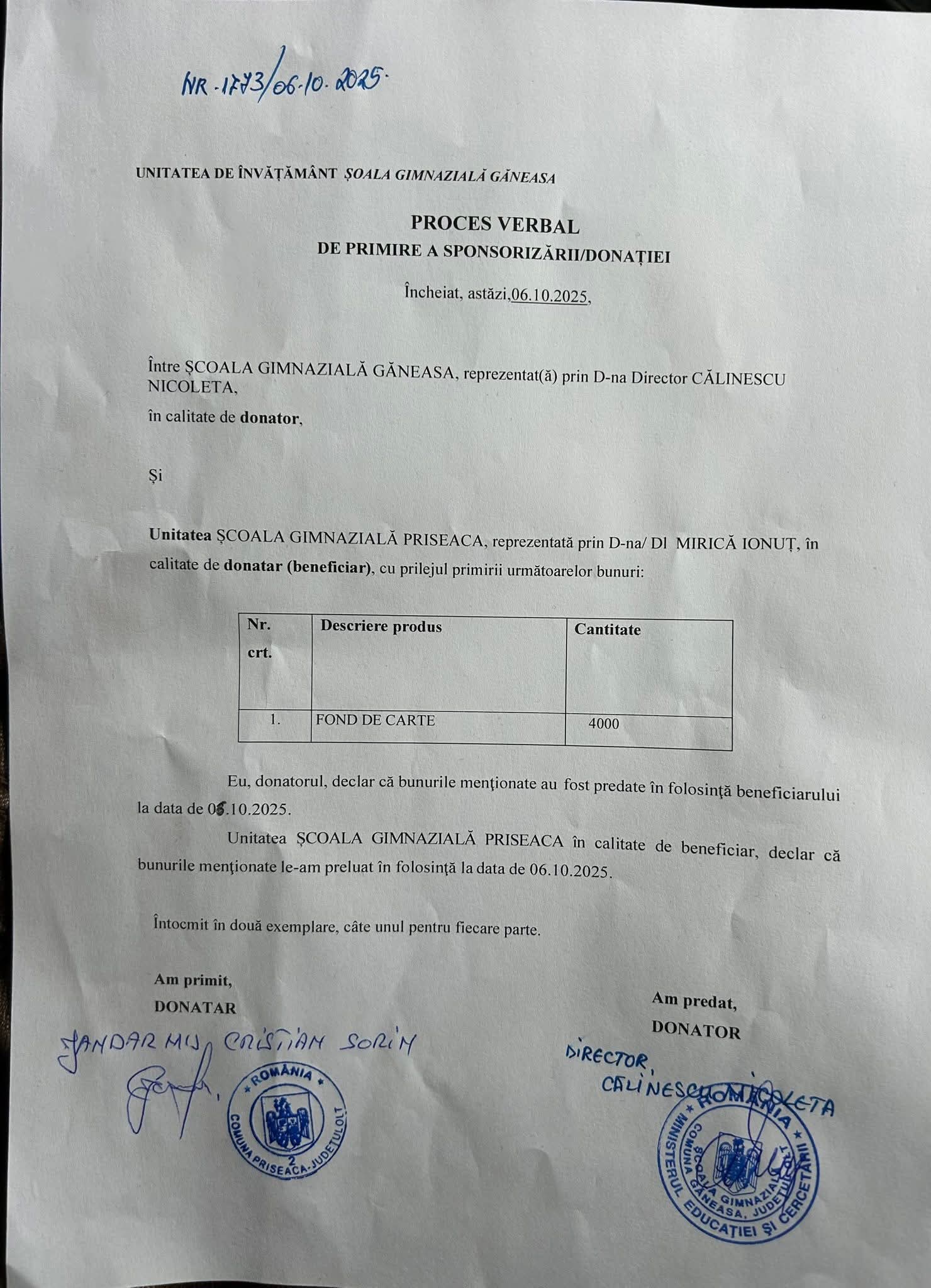 Anunțul a fost făcut chiar de Cristian Jandarmu, viceprimar al comunei Priseaca, cele două instituții școlare urmând a colabora pe viitor în diverse proiecte educaționale: „Cu ajutorul doamnei profesor documentarist Maria Gogiu, consăteanca noastră, Biblioteca Școlii Gimnaziale Priseaca s-a îmbogățit astăzi (luni n.r.) cu 4.000 de volume, oferite prin donație de către Școala Gimnazială Găneasa, reprezentată de doamna director Nicoleta Călinescu. Le mulțumim din suflet pentru acest gest frumos și generos, dar și domnului Mitel Băncilă, care ne-a sprijinit cu transportul cărților. Sperăm ca aceste volume să fie de folos elevilor și întregii comunități, să aducă inspirație, cunoaștere și bucurie celor care le vor răsfoi”.