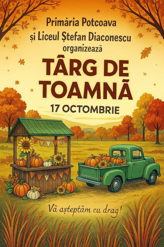 Primăria orașului Potcoava, în parteneriat cu Liceul „Ștefan Diaconescu”, Asociația „Mândri ca suntem romi”, Asociația GAL „De la Vedea la Olteț”, Ansamblul „Murgulețu” Potcoava, grupul vocal „Mândruțele de la Olt” și Gabriel Liu, organizează în această săptemână o nouă ediție a Târgului de Toamnă. Evenimentul este dedicat tradițiilor locale, comunității și bucuriei acestui frumos anotimp și va avea loc vineri, 17 octombrie 2025, cu începere de la ora 10:00, locația de desfășurare fiind lângă Primărie.