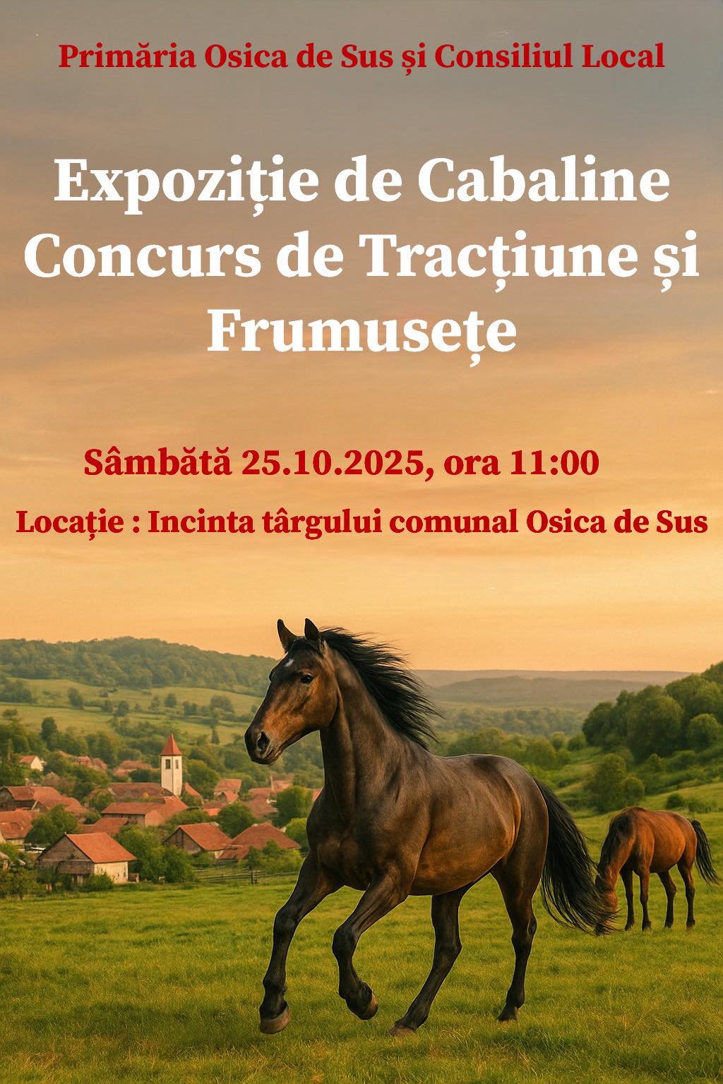„Sâmbătă, 25 octombrie 2025, ora 11:00, vă așteptăm la Târgul Comunal din Osica de Sus la Expoziția de Cabaline – Concurs de Tracțiune și Frumusețe! Vino să vezi cei mai frumoși și puternici cai din zonă și să petreci o zi plină de tradiție și spectacol!”, a transmis Cezar Filip, primarul localității oltene.