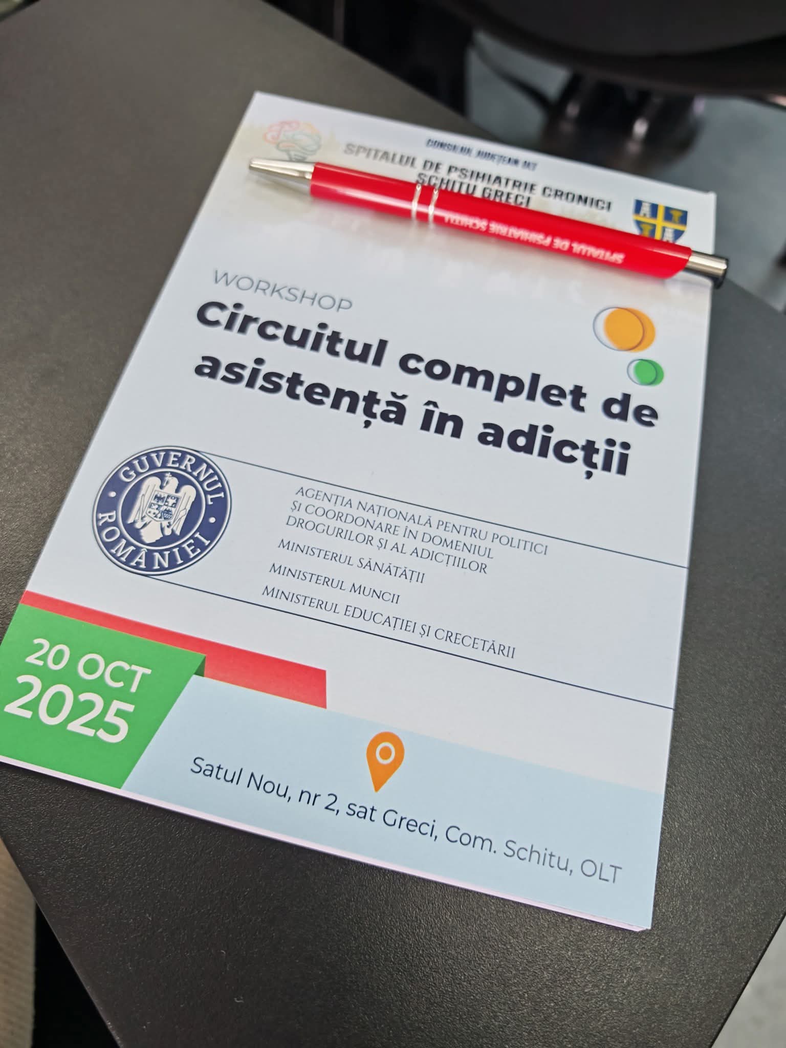 Spitalul de Psihiatrie Cronici Schitu Greci a organizat luni, 20 octombrie 2025, în parteneriat cu Agenția Națională pentru Politici și Coordonare în Domeniul Drogurilor și al Adicțiilor, workshopul cu tema „Circuitul complet de asistență în adicții”, printre participanți fiind reprezentanți ai mai multor instituții de la nivel central și nivel local cu atribuții în domeniu.