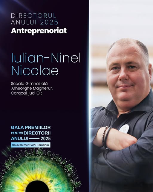 Cel care a urcat pe scenă a fost Iulian Ninel Nicolae, directorul Școlii Gimnaziale „Gheorghe Magheru” din Caracal, care a fost desemnat Directorul Anului 2025 pentru Antreprenoriat.