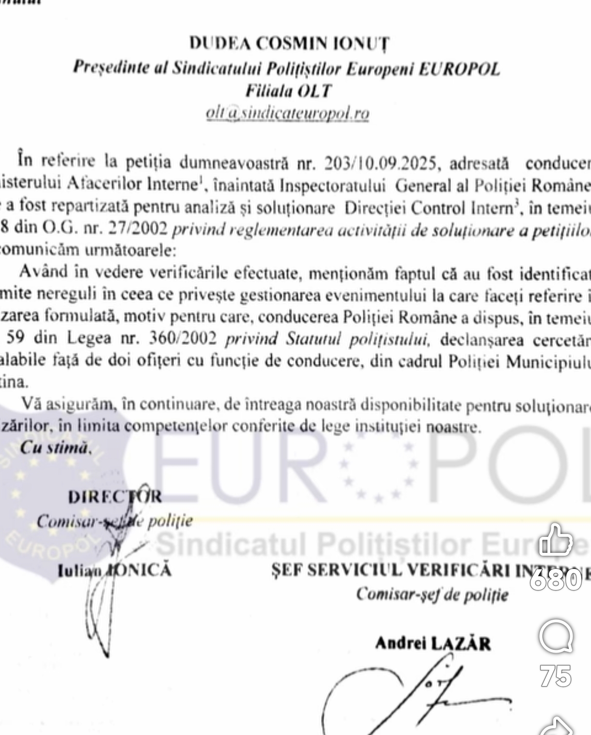 „De curând am aflat despre modalitatea în care șefii din cadrul IPJ Olt au încercat să mușamalizeze o infracțiune de ultraj comisă asupra unuia dintre colegii noștri care își desfășoară activitatea la nivelul Poliției municipiului Slatina. Practic, în timp ce polițistii se aflau în serviciul de patrulare, au observat un individ care a încercat să lovească un bărbat cu o sticlă în zona capului. Doar intervenția promptă a colegei noastre polițiste, care a barat lovitura, a împiedicat o posibilă tragedie. Din păcate, în timpul intervenției, colega noastră a fost agresată fizic, fiind trasă de păr de către individul violent, care a fost ulterior imobilizat cu sprijinul unei alte patrule. Deși fapta reprezenta o infracțiune de ultraj, conducerea Poliției municipiului Slatina nu a înregistrat evenimentul și nu a raportat agresiunea, preferând să minimalizeze incidentul. În lipsa oricărei reacții instituționale, colega noastră a fost nevoită să formuleze personal plângere la Parchet, în urma căreia agresorul a fost arestat preventiv pentru 30 de zile. Cu privire la modul în care conducerea IPJ Olt a ales să trateze un eveniment atât de grav, organizația noastră a sesizat conducerea Poliției Române pentru modul defectuos de gestionare a situației”, potrivit postării Europol pe pagina oficială de socializare.
